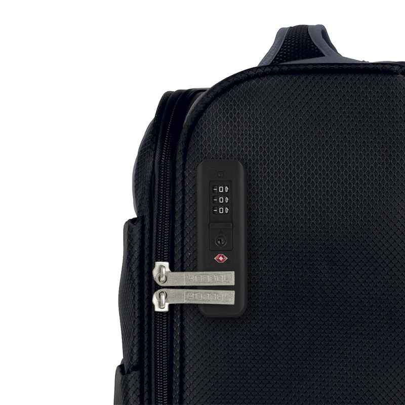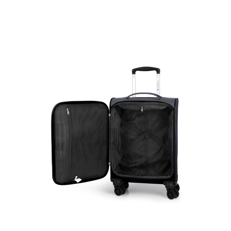 Maleta de tamaño cabina blanda, con capacidad de hasta 31 L y 4 ruedas dobles. El material de fabricación es poliéster y su interior está compuesto por un forro de alta calidad y separador interior. Tiene un tamaño apto para cabina y la constitución de sus materiales hacen que su peso sea ligero, perfecto para la movilidad. Cerradura TSA.