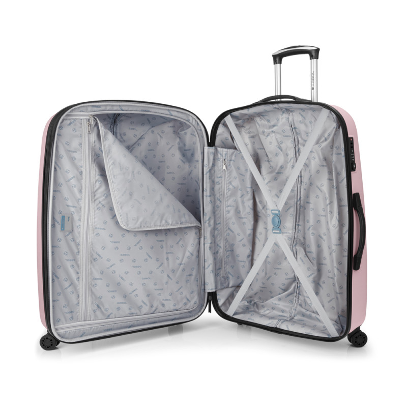 Maleta grande rígida expandible y 4 ruedas dobles multidirección. Fabricada en ABS. Su interior está compuesto por un forro de alta calidad con separador y bolsillo. Cerradura TSA. Medidas sin y con expandible: Maleta Grande: 77x54x29/32,5 cm - Peso: 4,6 kg - Capacidad: 100/112 L.