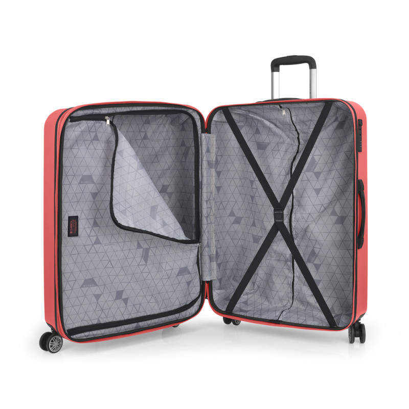 Maleta grande rígida, con expandible y con capacidad hasta 105,5 L. Fabricadas en ABS. Su interior esta compuesto por un forro, con un separador y un bolsillo. Cuentan con 4 ruedas dobles multidirección. Cerradura de combinación. Medidas sin y con expandible: Maleta grande: 54x76x30/33 cm - Peso: 4,7 kg - Capacidad: 105,5/116,1 L.