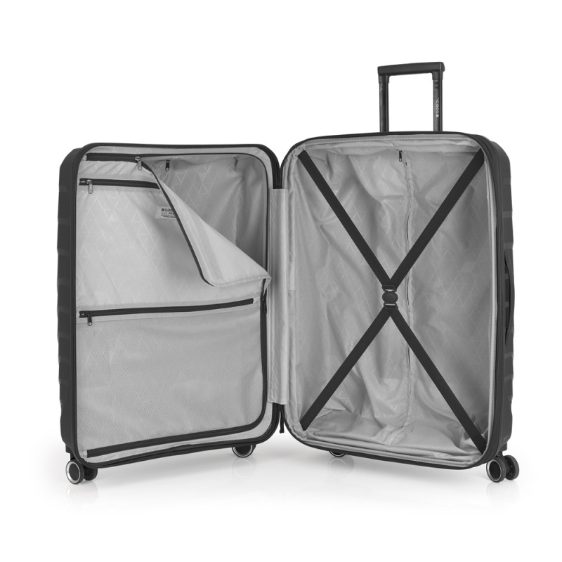 Para viajes largos o grandes aventuras, la maleta grande SOHO de Gabol te ofrece espacio, resistencia y elegancia. Fabricada en Polipropileno, soporta los impactos del viaje sin perder estilo. Su interior está completamente forrado con material reciclado RPET y equipado con prácticos separadores y cintas de sujeción. La cerradura TSA y la cremallera de seguridad mantienen todo protegido. Sus 4 ruedas dobles multidireccionales permiten un manejo cómodo y suave. Medidas: 53 x 77 x 22 cm | Capacidad: 110,6 /121,3L | Peso: 4,5 kg.