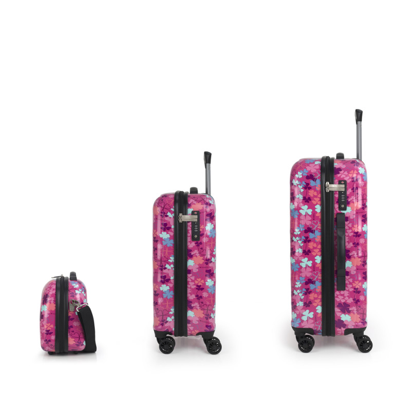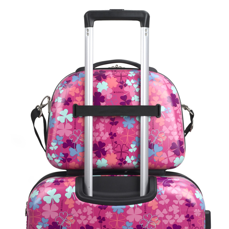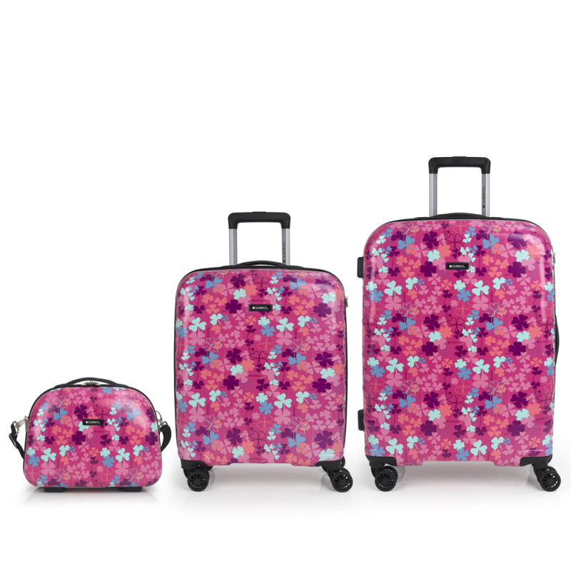 Set de maleta de cabina, mediana y neceser Gabol CLOVER. Colección Clover de Gabol, con un bonito estampado de tréboles sobre un fondo rosa. Set de una maleta de cabina con 4 ruedas dobles, con capacidad total de 37,6L, una maleta mediana con 4 ruedas dobles con capacidad total de 65,2L y neceser. El material de fabricación es ABS con film y su interior está compuesto por un forro de alta calidad con bolsillos. Tiene dos tamaños diferentes para tus necesidades de viaje, maleta de cabina apta como equipaje de mano. Incluye cerradura TSA. El neceser incluye bandolera y acople para la maleta que facilita su transporte. Medidas Maleta Cabina: 40x55x20 cm Medidas Maleta Mediana: 47x66x25 cm Medida Neceser: 35x29x17 cm