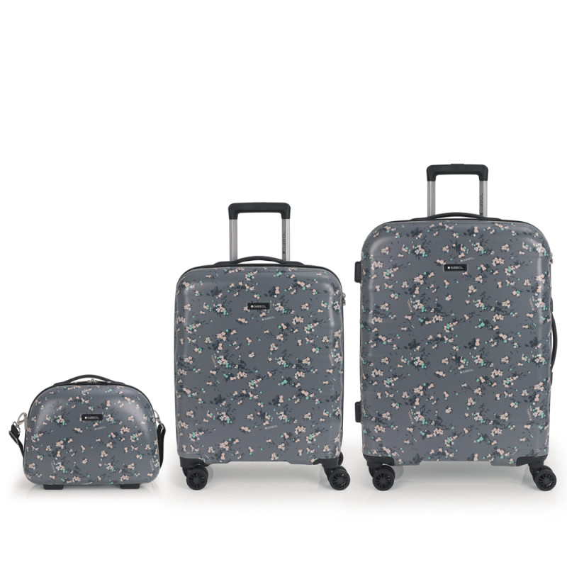 Set de maleta de cabina, mediana y neceser Gabol. Set de una maleta de cabina con 4 ruedas dobles, con capacidad total de 37,6L, una maleta mediana con 4 ruedas dobles con capacidad total de 65,2L y neceser. El material de fabricación es ABS y Policarbonato y su interior está compuesto por un forro de alta calidad con bolsillos. Tiene dos tamaños diferentes para tus necesidades de viaje, maleta de cabina apta como equipaje de mano. Incluye cerradura TSA. El neceser incluye bandolera y acople para la maleta que facilita su transporte. Medidas Maleta Cabina: 40x55x20 cm Medidas Maleta Mediana: 46x66x25 cm Medida Neceser: 35x29x17 cm