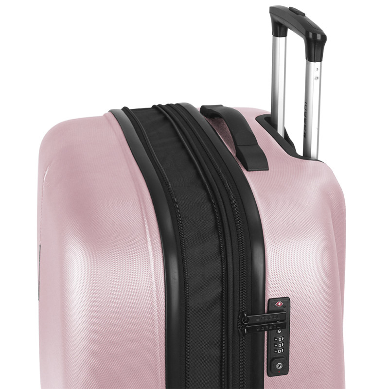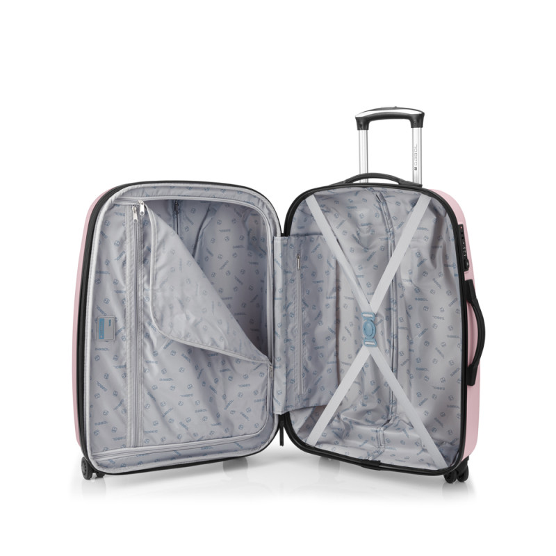Maleta mediana rígida expandible y 4 ruedas dobles multidirección. Fabricada en ABS. Su interior está compuesto por un forro de alta calidad con separador y bolsillo. Cerradura TSA. Medidas sin y con expandible: Maleta Mediana: 67x48x27/30,5 cm - Peso: 3,8 kg - Capacidad: 70/79 L.