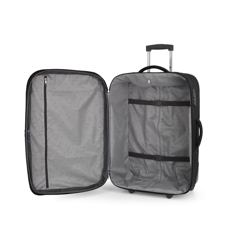 Maleta mediana blanda, cexpandible y 2 ruedas. Fabricada en Poliéster. Su interior está compuesto con un bolsillo organizador. Cerradura de combinación. Medidas sin y con expandible: Maleta Mediana: 44x66x27/31,5 cm - Peso: 2,8 kg - Capacidad: 66,6/76,9 L.
