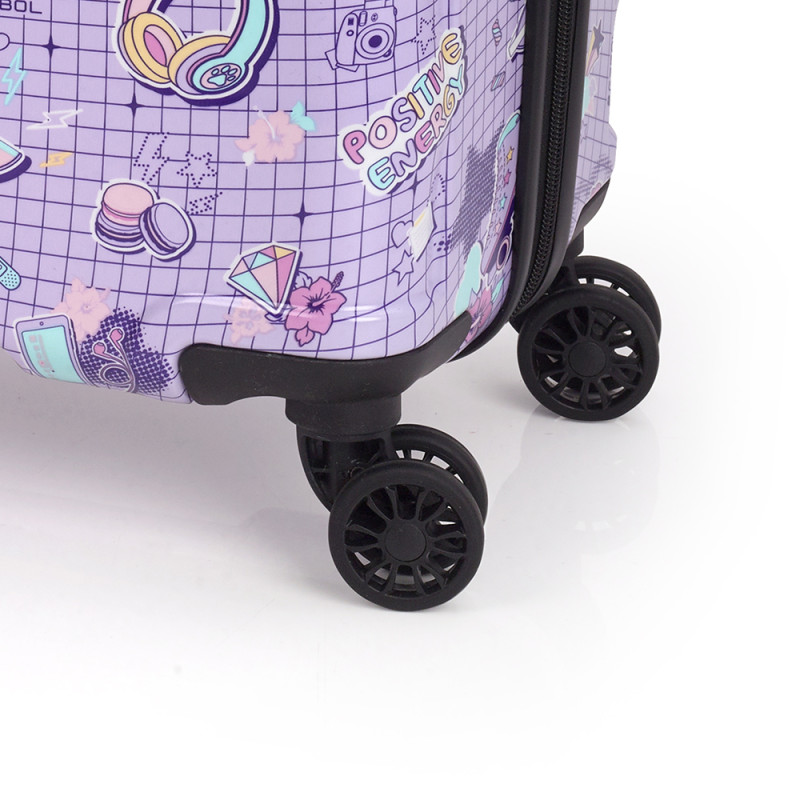 Maleta mediana Gabol FUNNY. Colección Funny de Gabol, con un bonito estapado de elementos simbólicos escolares sobre un fondo lila. Maleta mediana con 4 ruedas dobles, con capacidad total de 65,2L. El material de fabricación es ABS y policarbonato y su interior está compuesto por un forro de alta calidad con bolsillos. Incluye cerradura TSA. El neceser incluye bandolera y acople para la maleta que fcilita su transporte. Medidas Maleta Mediana: 47x66x25 cm