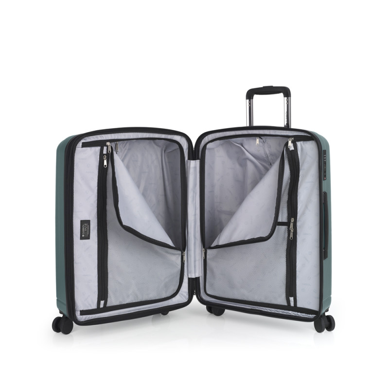 Maleta mediana rígida, con expandible y con capacidad hasta 72,6 L. Fabricadas en Policarbonato. Su interior esta compuesto por un forro de material reciclado, con doble separador y bolsllos. 4 ruedas dobles multidirección. Cremallera de seguridad. Cerradura TSA. 10 años de garantía. Medidas sin y con expandible: Maleta mediana: 45x65x28/31 cm - Peso: 3,6 kg - Capacidad: 72,6/80,4 L.
