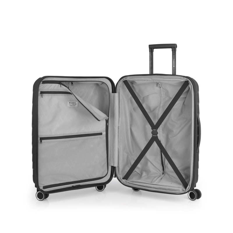 La maleta mediana SOHO de Gabol está diseñada para quienes buscan equilibrio entre capacidad y movilidad. Fabricada en Polipropileno, ofrece gran resistencia a golpes y arañazos. Equipada con cerradura TSA y cremallera de seguridad, mantiene tus pertenencias protegidas durante todo el trayecto. Su interior está forrado con tejido reciclado RPET, presenta compartimentos organizadores y cintas elásticas para una distribución eficiente del equipaje. Cuenta con 4 ruedas dobles multidireccionales que garantizan un deslizamiento suave y estable. Con unas medidas de 47x67x27/30 cm, un volumen de 71,2/79,2 L y su peso de 3,4 kg, es perfecta para viajes de varios días.