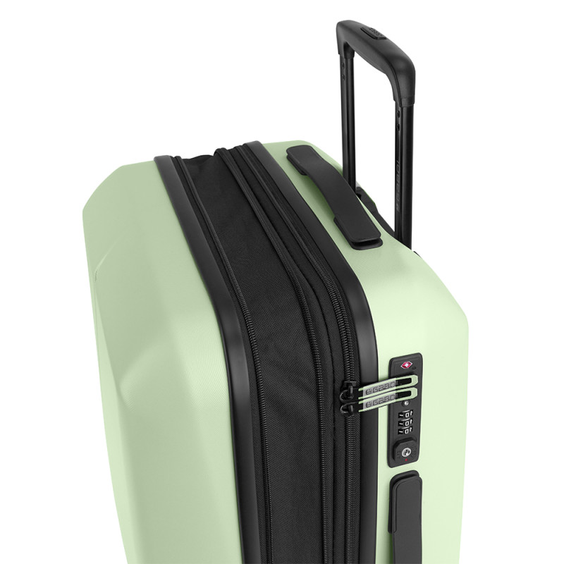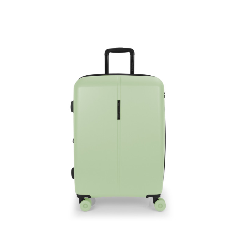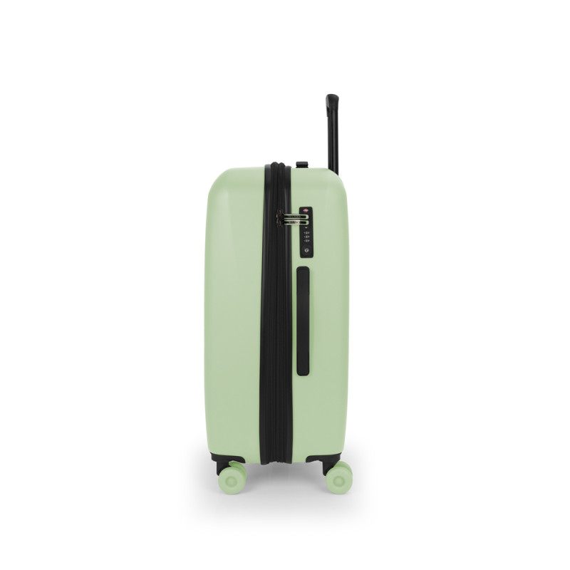 Maleta mediana rígida, expandible. Fabricada en polipropileno. Su interior esta compuesto con un forro de material reciclado, un separador y un bolsillo. Cuenta con 4 ruedas dobles silenciosas y cerradura TSA. Medidas sin y con expandible: Maleta mediana: 44x65x27/30 cm - Peso: 3,5 kg - Capacidad: 69/76,5 L.