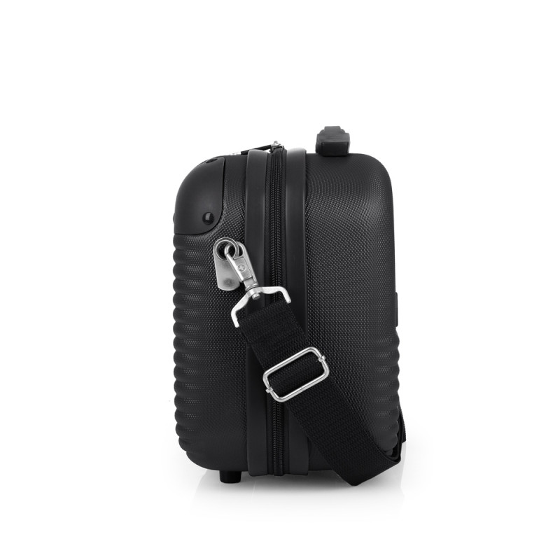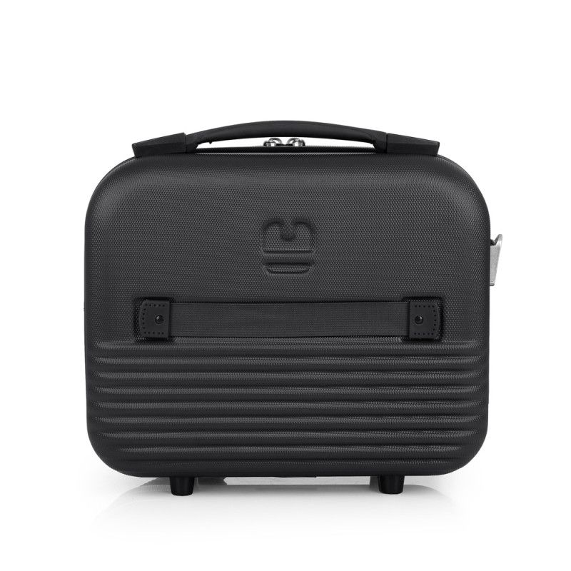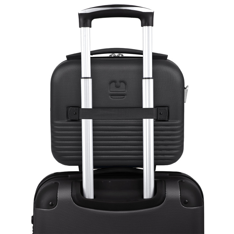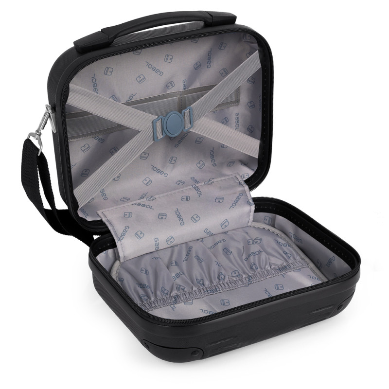 Neceser rígido de ABS con acople a maleta y correa. Interior forrado con material reciclado RPTE y con clasificador. Medidas sin y con expandible: Neceser: 28x30x18 cm - Peso: 1 Kg - Capacidad: 12 L.