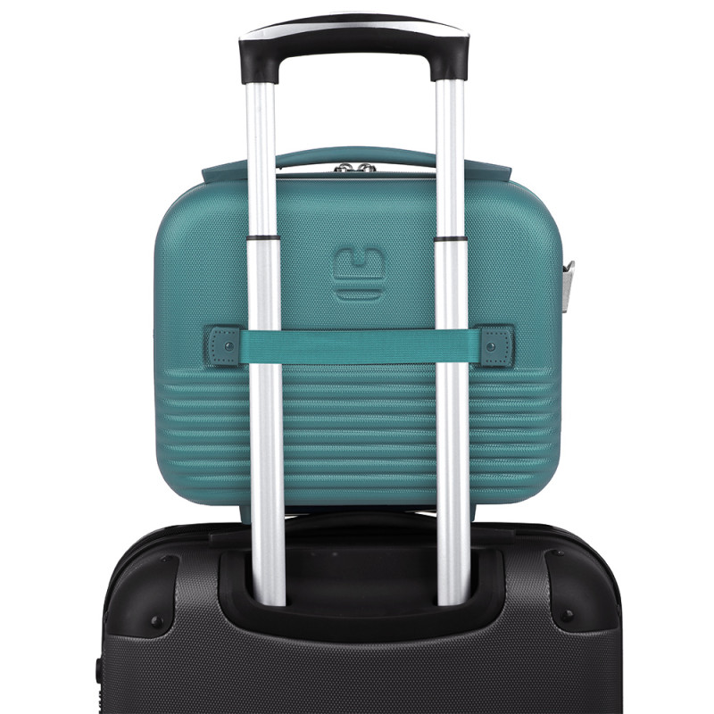 Neceser rígido de ABS con acople a maleta y correa. Interior forrado con material reciclado RPTE y con clasificador. Medidas sin y con expandible: Neceser: 28x30x18 cm - Peso: 1 Kg - Capacidad: 12 L.