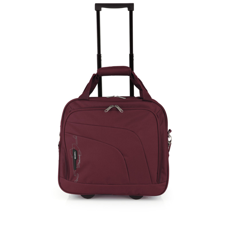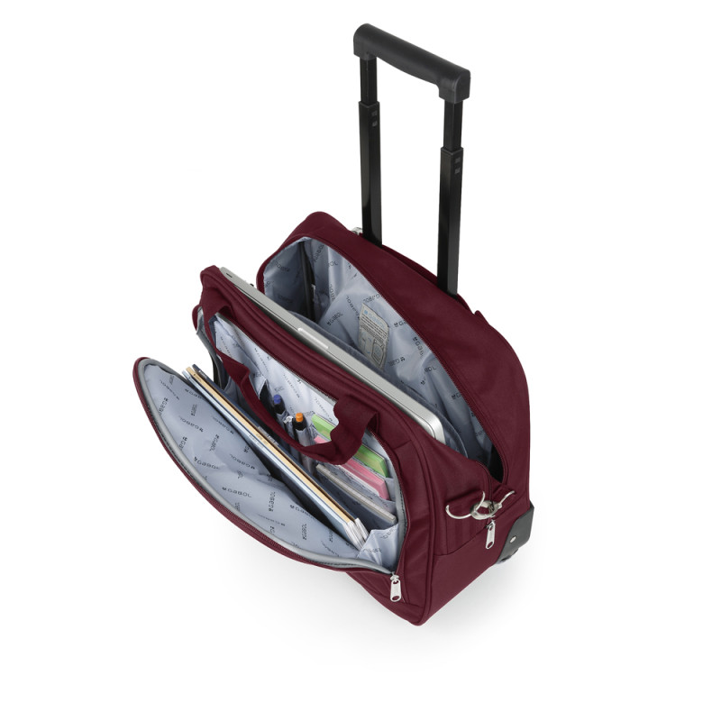 Maletín con dos ruedas fabricado con material reciclado. Compartimento para portátil de 15,6''. Medidas: 40x36x19. Altura con tirador totalmente extendido: 101 cm.