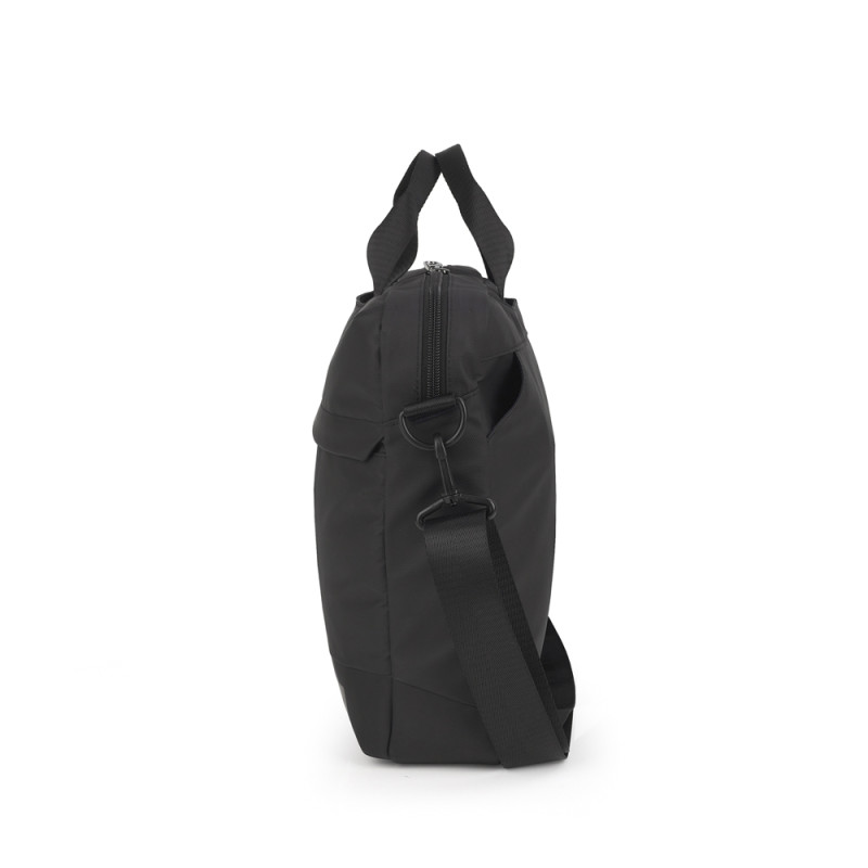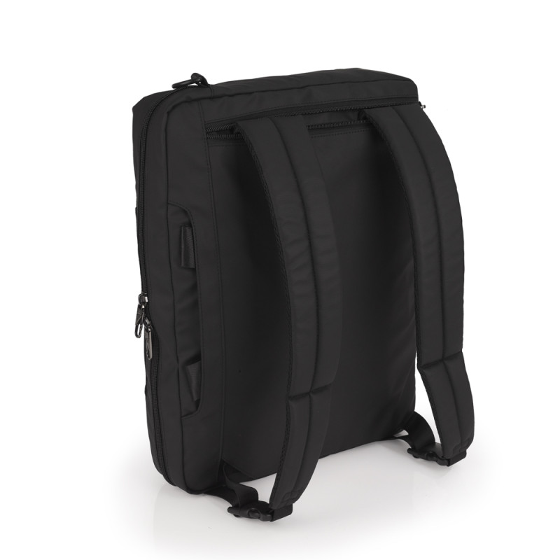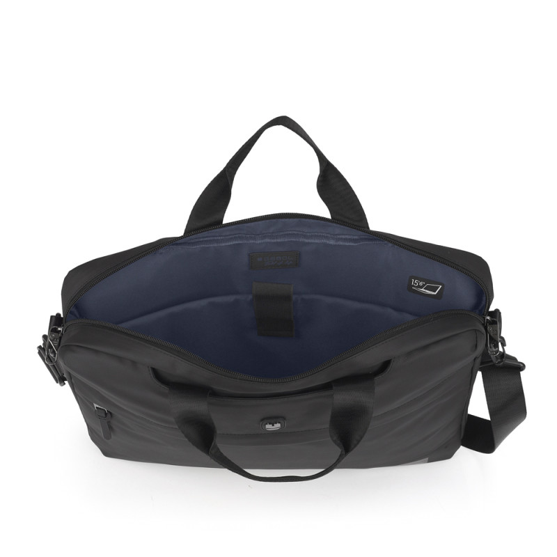 Maletín para portátil de 15,6'' de poliéster resinado y piel sintética, negro. El interior del maletín está forrado y acolchado, con organizador para portátil. Convertible en mochila. Fabricado con material libre de plásticos PVC. Medidas: 42x31x7 cm. Volumen: 9 L.