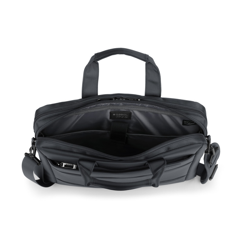 Maletín para portátil 15,6'' de poliéster, resistente al agua. El interior del maletín está forrado y acolchado, con organizador para portátil. Lleva cinta para acoplarlo en una maleta. Medidas maletín: 42x31x8 cm. Volumen: 10L.