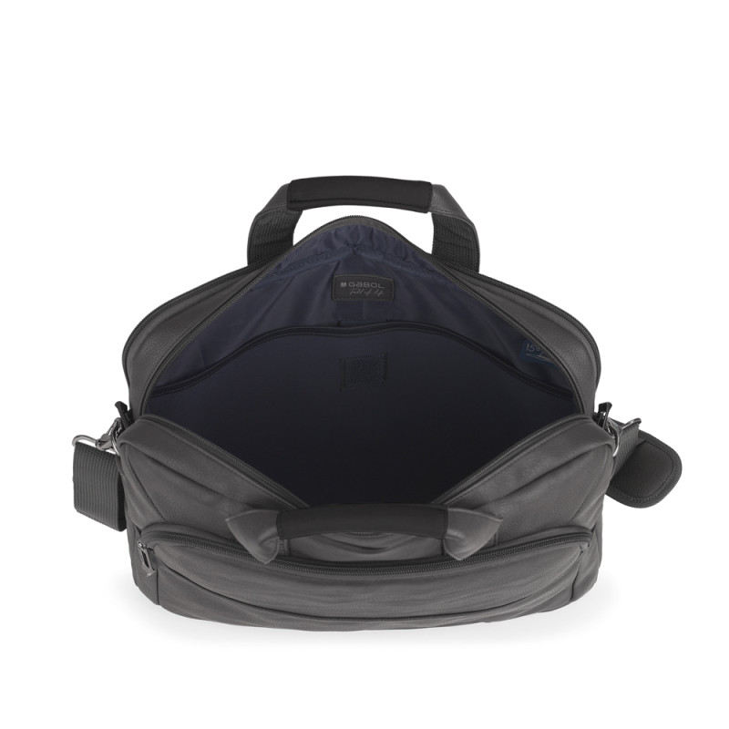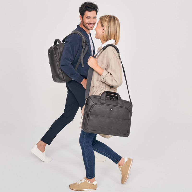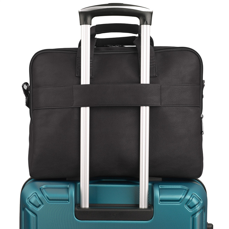 Maletín para portátil de 15,6´´ con 2 compartimentos. Material de piel sintética libre de plásticos PVC. Interior acolchado con compartimento para portátil y organizador. Acople para maleta en la parte trasera.