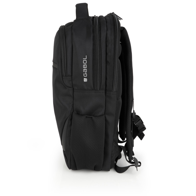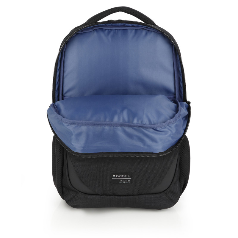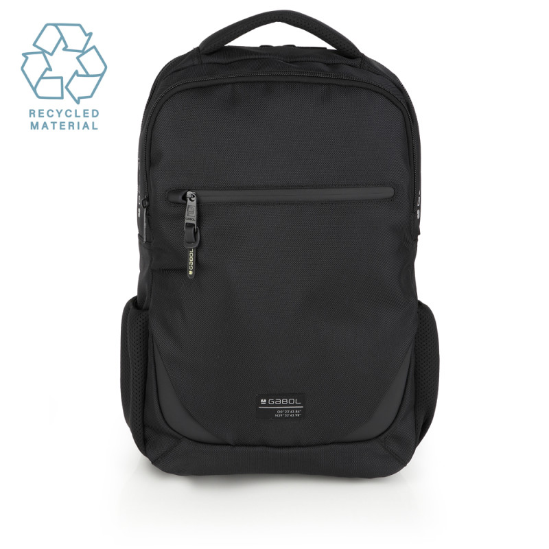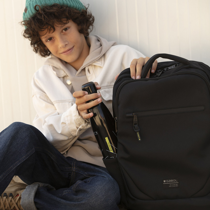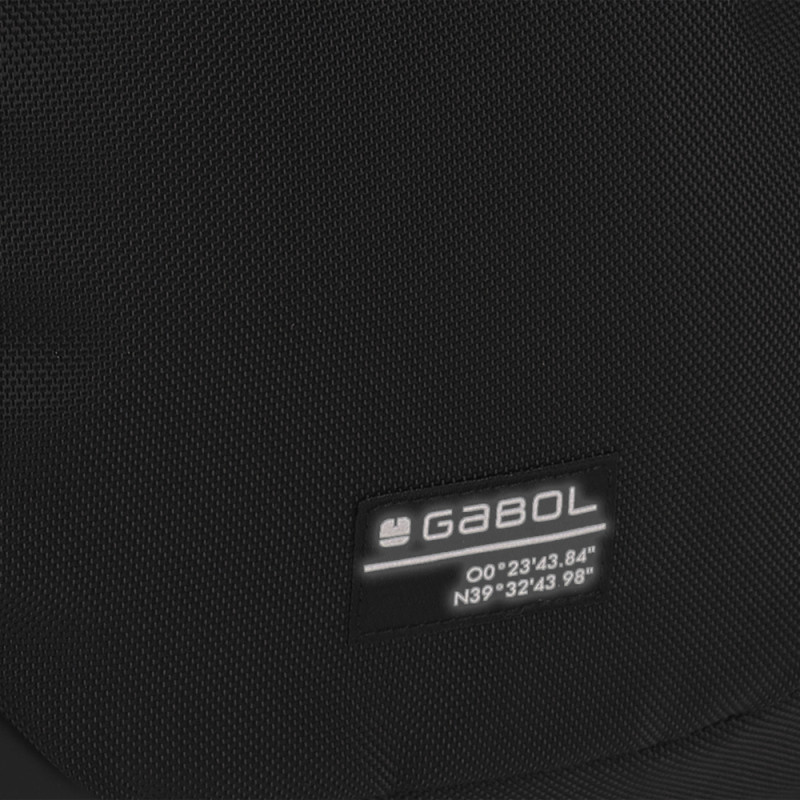 Mochila de dos compartimentos Gabol PANTHER. Fabricada con material reciclado, resistente al agua y libre de PVC, con un tejido de alta densidad y alta calidad. Contiene identificador para poner el nombre, organizador y cinta de acople a pecho. Etiqueta reflectante. Medidas: 30x45x12 cm.