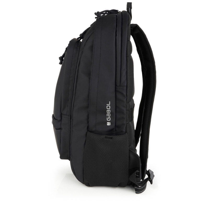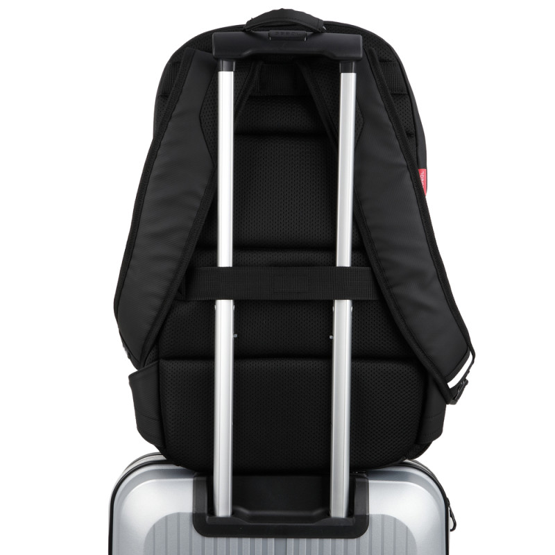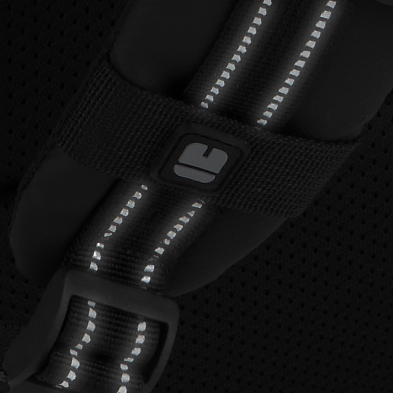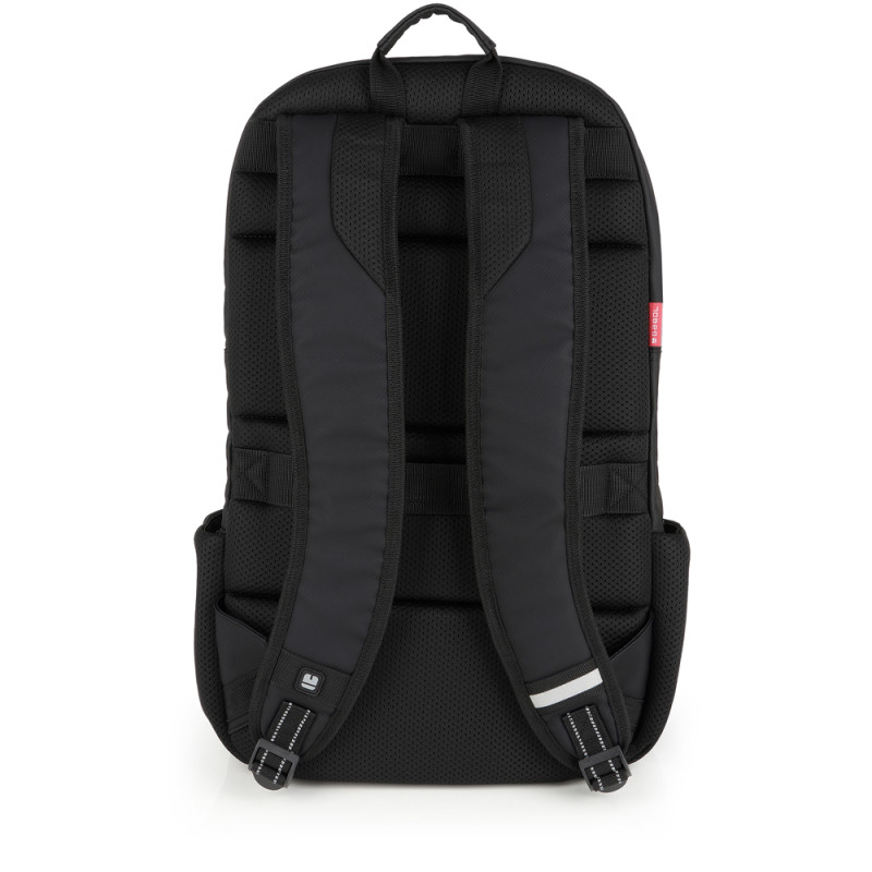 Mochila de dos compartimentos. Fabricada con materia resistente al agua de poliéster resinado y piel sintética. Espalda y hombreras acolchadas, además se puede acoplar a carro. Contiene organizador interior. Etiqueta reflectante. Medidas: 30x52x16 cm.