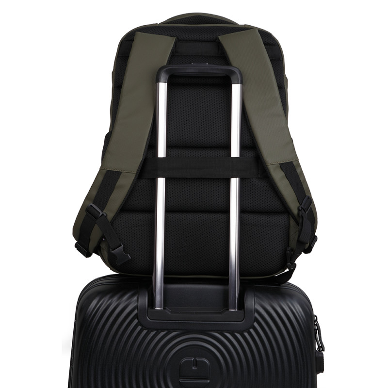 Mochila para portátil de 17,3" con 2 departamentos, de poliéster, con clasificador, organizador y con acople a maleta. Incluye forro de alta calidad, acolchado y con organizador para portátil. Fabricado con material libre de plásticos PVC. Medidas: 33x47x18 cm. Volumen: 24,8 L