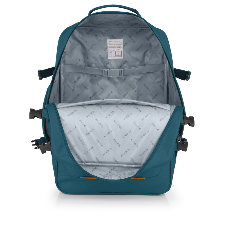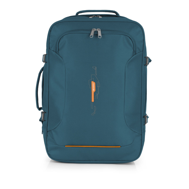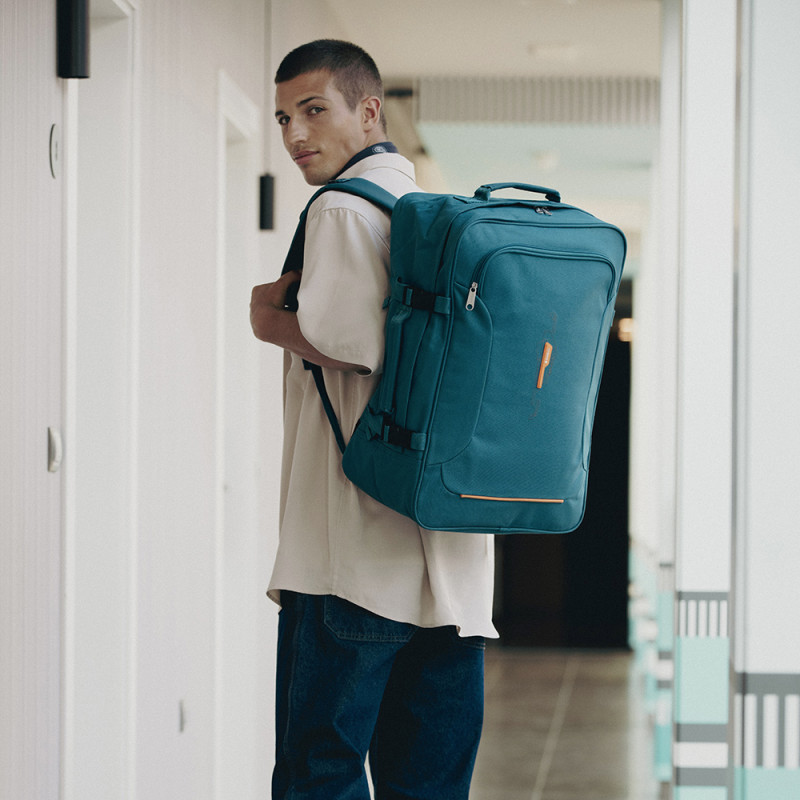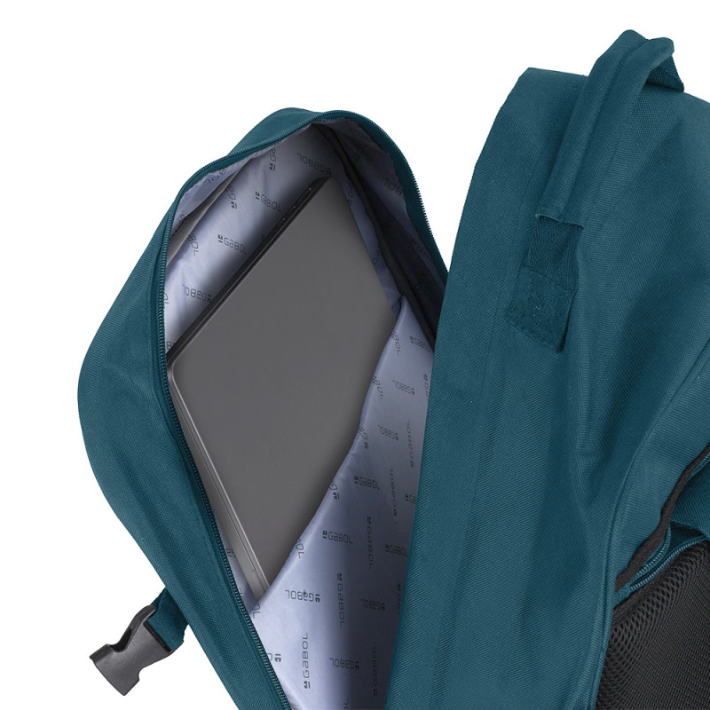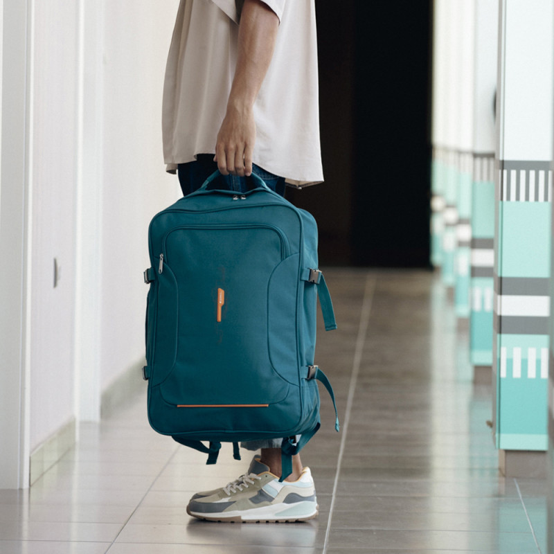 "Mochila de material reciclado, blanda, ligera, con capacidad hasta 35 L. El material de fabricación es PET reciclado y su interior está compuesto por un forro de alta calidad y compartimento para portatil (17,3"""") de fácil acceso. Tiene un tamaño apto para cabina y la constitución de sus materiales hacen que su peso sea ligero, perfecto para la movilidad."