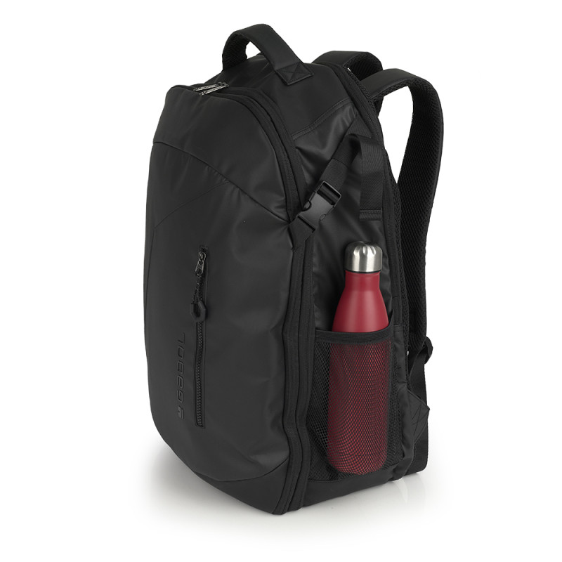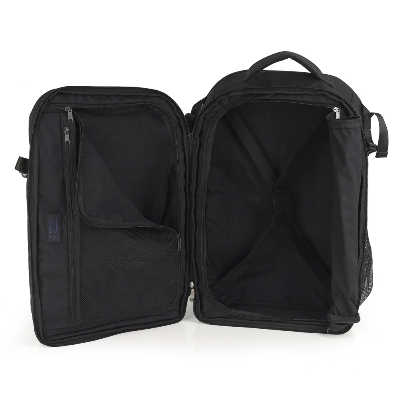 Mochila cabina apta como equipaje de mano, con 2 departamentos, organizador interno y acople a maleta. Fabricado en poliéster resinado y piel sintética, compuesto por un forro de alta calidad y un organizador interno. Medidas: 35x55x18,5/23 cm - Peso: 1 kg - Capacidad: 38,5/44 L