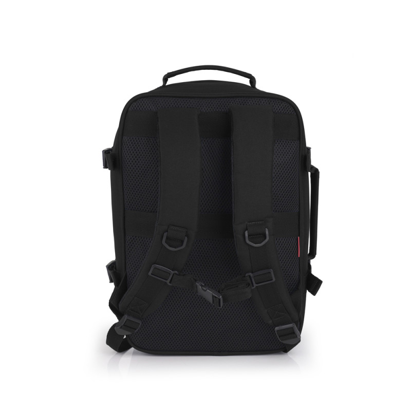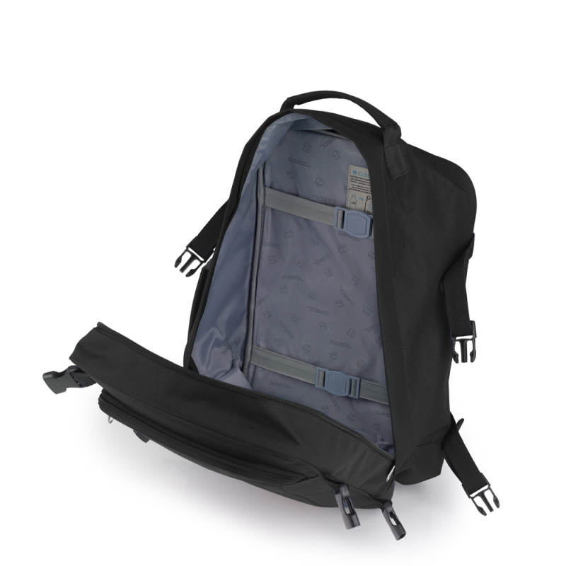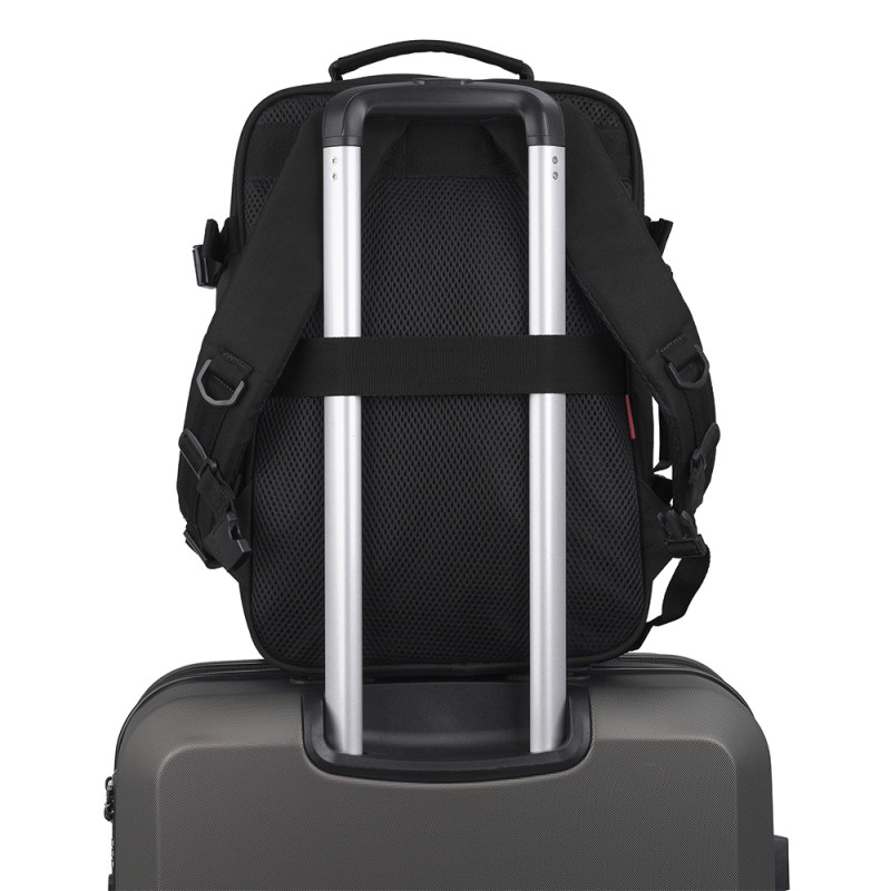 Mochila de viaje con medidas para equipaje de mano. Compartimento para portátil de 14''. Cinta ajustable a la altura del pecho. Cinta para acoplar a maleta. Fabricada en material reciclado.