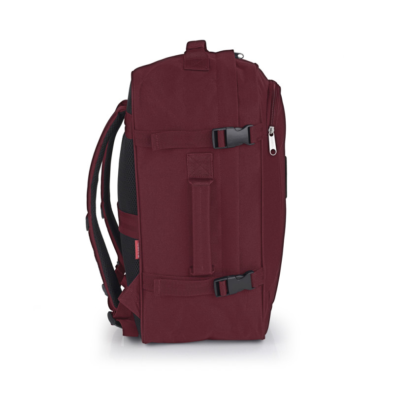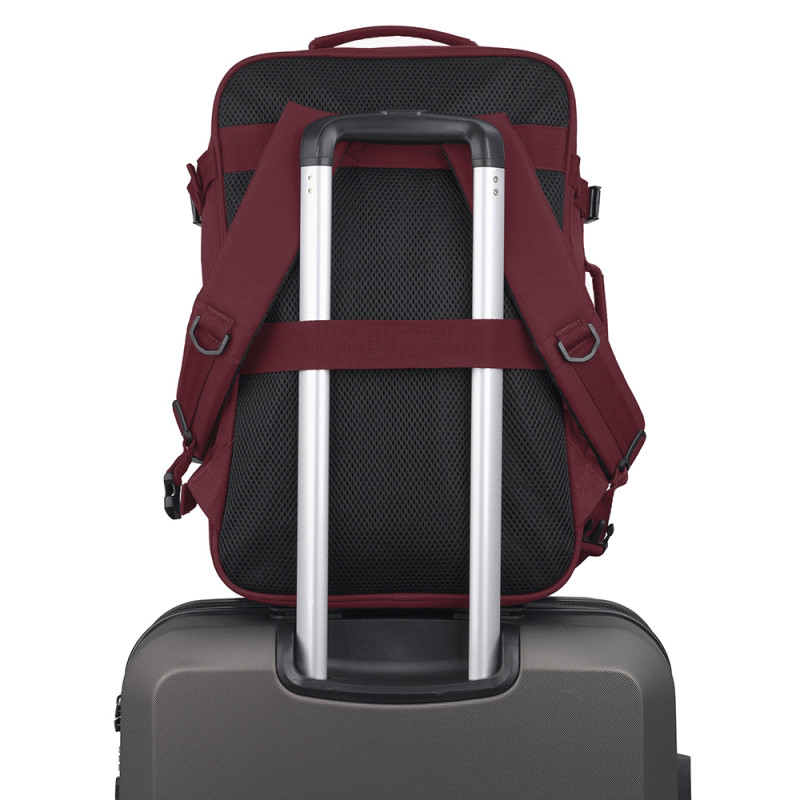 Mochila de viaje con medidas para equipaje de mano. Compartimento para portátil de 15,6''. Cinta ajustable a la altura del pecho. Cinta para acoplar a maleta. Fabricada en material reciclado.