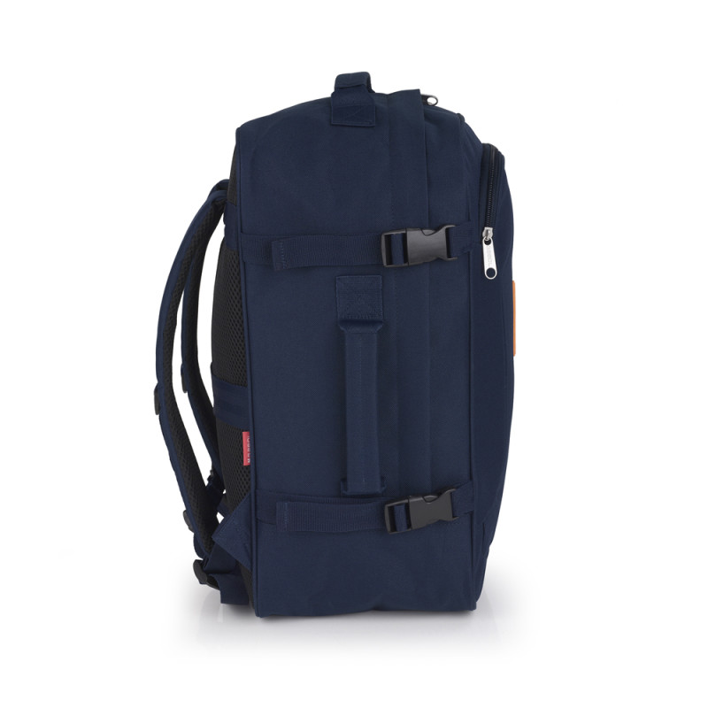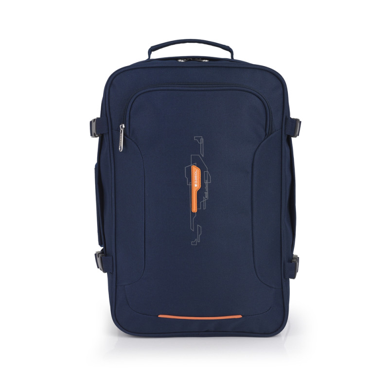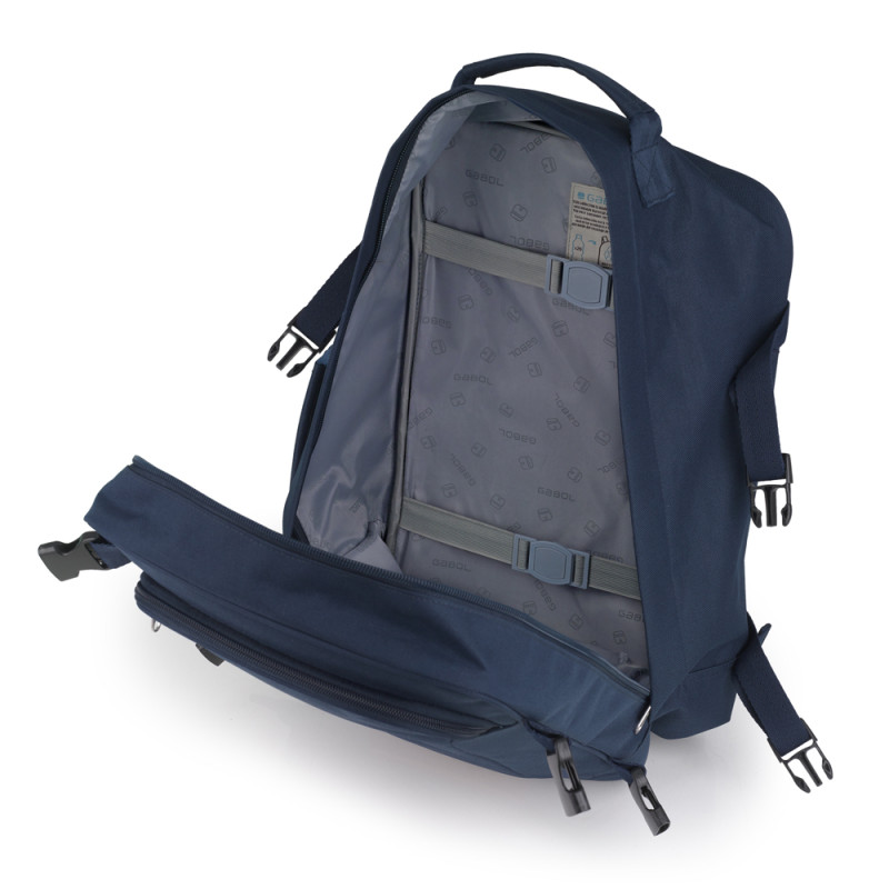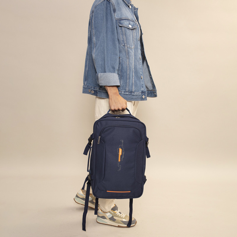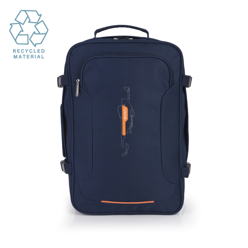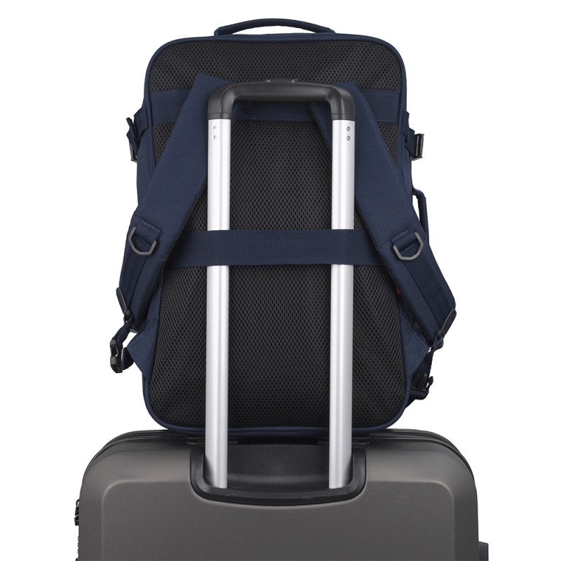 Mochila de viaje con medidas para equipaje de mano. Compartimento para portátil de 15,6''. Cinta ajustable a la altura del pecho. Cinta para acoplar a maleta. Fabricada en material reciclado.