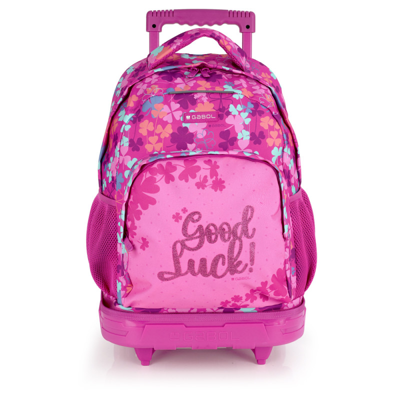 Mochila con ruedas desmontable Gabol CLOVER. Mochila con ruedas desmontable resistente al agua. Fácilmente desmontable con un sistema adherente, para facilitar el lavado y poder hacer uso de ella sin carro. Espalda acolchada para servir de amortiguación con el contenido. Hombreras acolchadas y reforzadas. Bolsillo en el lateral exterior. Su material impermeable junto a las cremalleras cubiertas protegen totalmente el interior de la lluvia. El tirador totalmente extendido mide 92 cm. Medidas: 34x46x20 cm