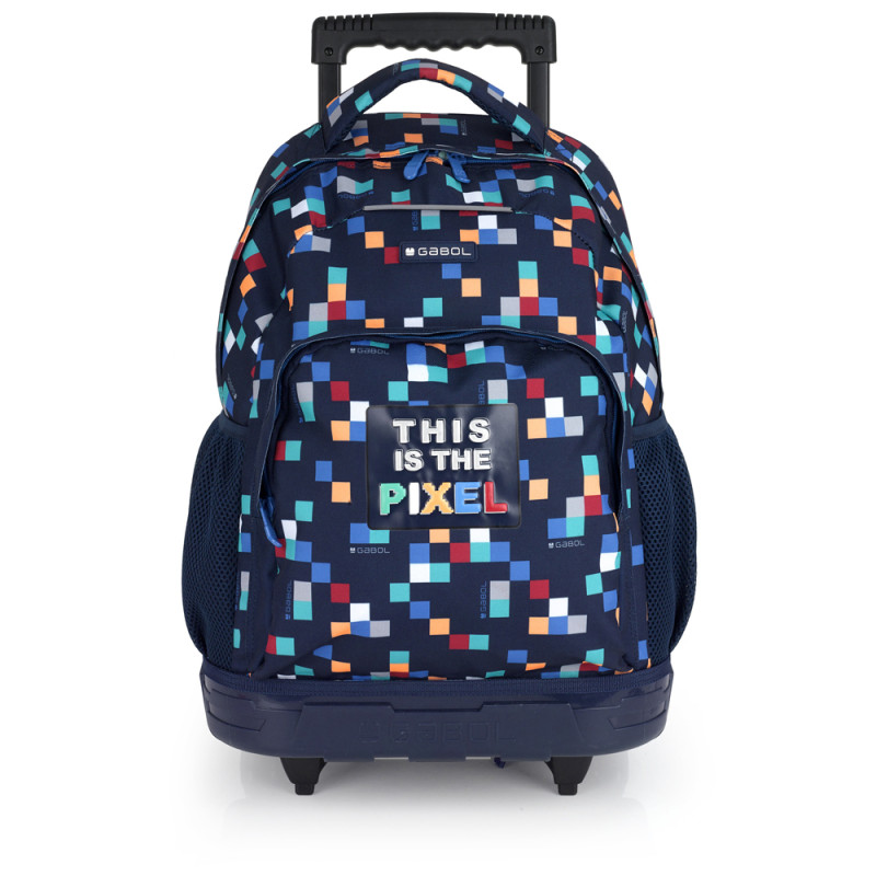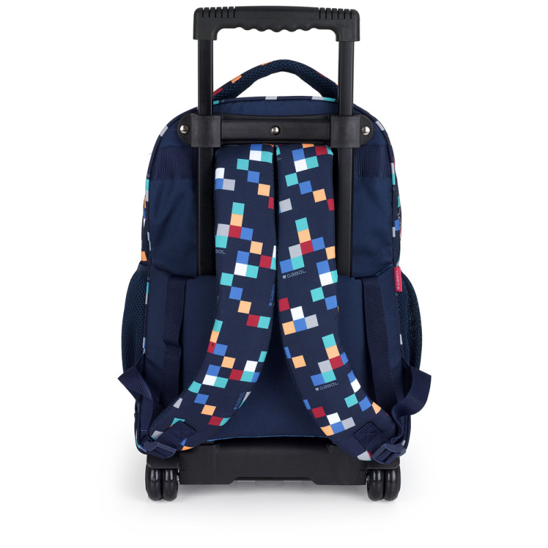 Mochila con ruedas Gabol CUBIK. Mochila con ruedas resistente al agua. Espalda acolchada para servir de amortiguación con el contenido. Hombreras acolchadas y reforzadas. Bolsillo en el lateral exterior. Su material resistente al agua, junto a las cremalleras cubiertas protegen el interior de la lluvia. El tirador totalmente extendido mide 92 cm. Medidas: 34x46x20 cm