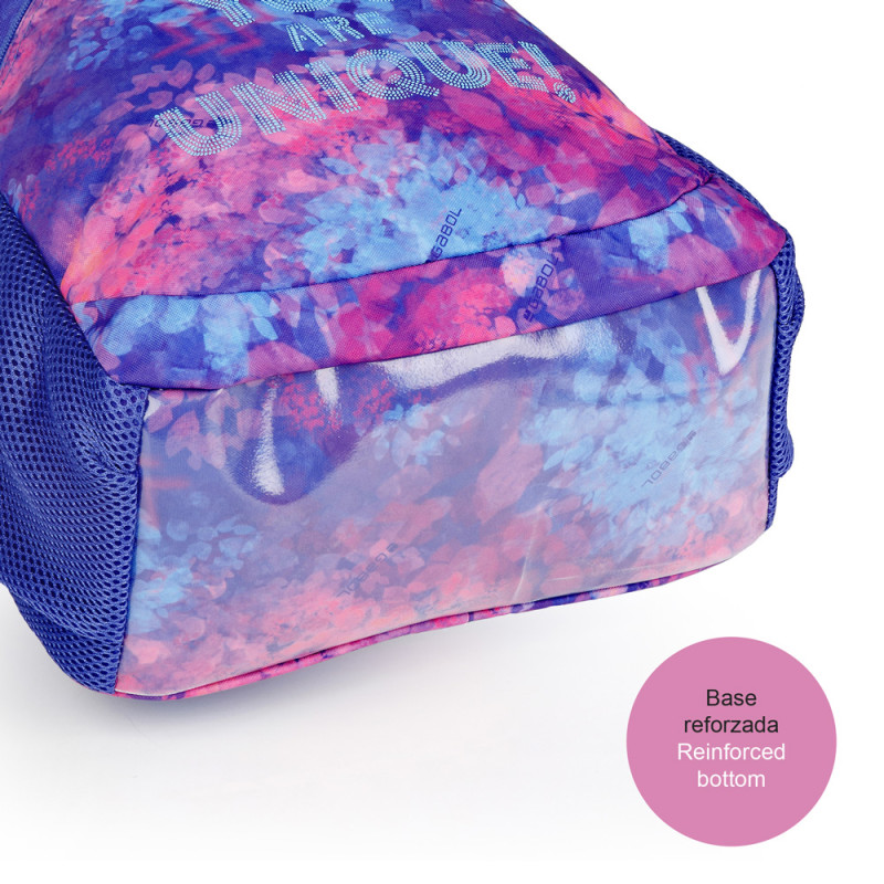 Mochila adaptable a carro Gabol SUNSET. Mochila adaptable a carro con material resistente al agua. Su espalda termoformada ofrece, a su vez, comodidad y una protección ideal para amortiguar los objetos del interior. Base acolchada con protector de plástico de refuerzo. Hombreras acolchadas y reforzadas. Incluye identificador y organizador en su interior. Bolsillo en el lateral exterior. Fabricada con material libre de PVC, con un tejido de alta densidad y mayor calidad. Medidas: 31x41x15 cm