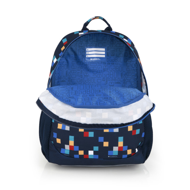 Mochila adaptable a carro Gabol CUBIK. Mochila adaptable a carro con material resistente al agua. Su espalda termoformada ofrece, a su vez, comodidad y una protección ideal para amortiguar los objetos del interior. Base acolchada con protector de plástico de refuerzo. Hombreras acolchadas y reforzadas. Incluye identificador y organizador en su interior. Bolsillo en el lateral exterior. Fabricada con material libre de PVC, con un tejido de alta densidad y mayor calidad. Medidas: 31x41x15 cm