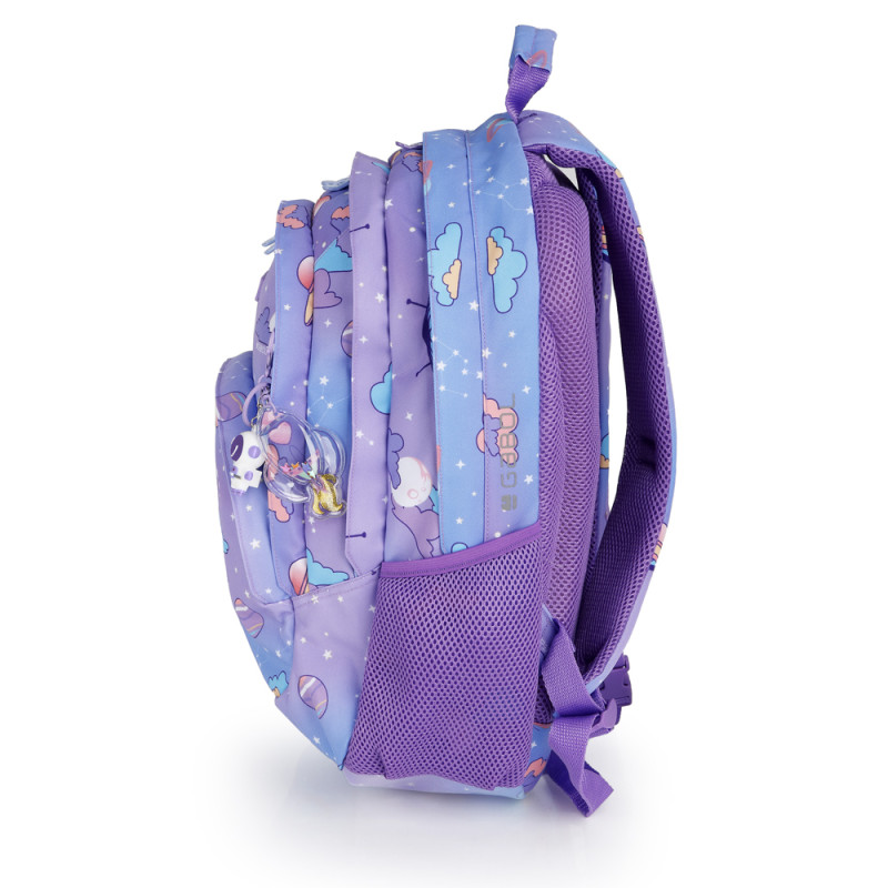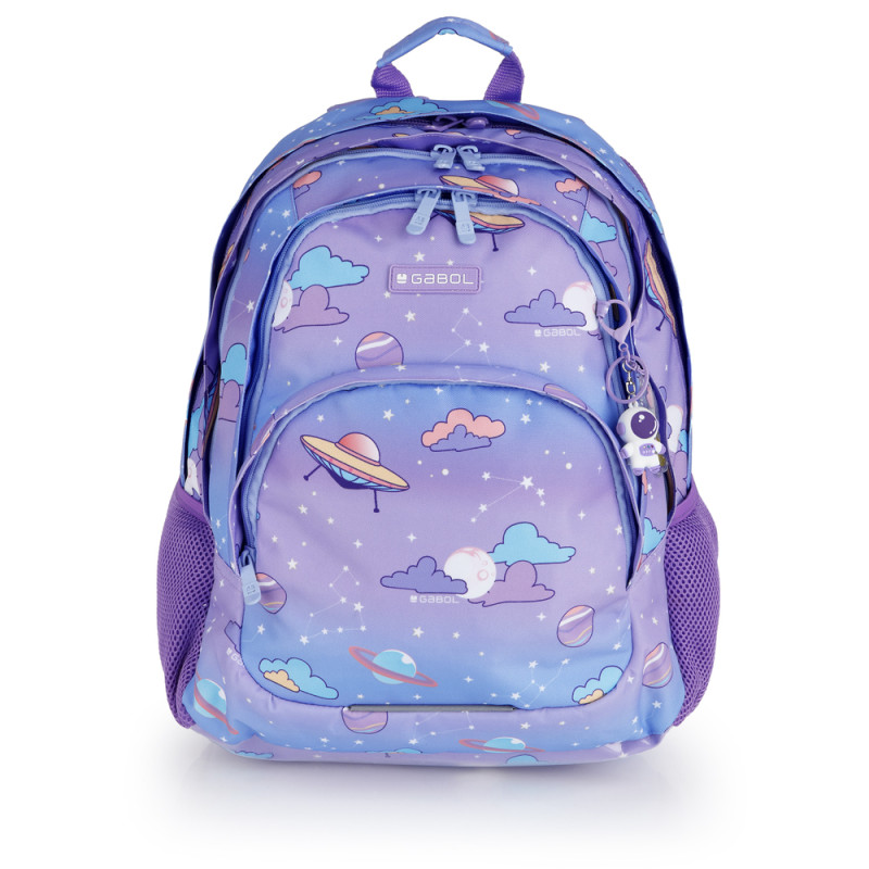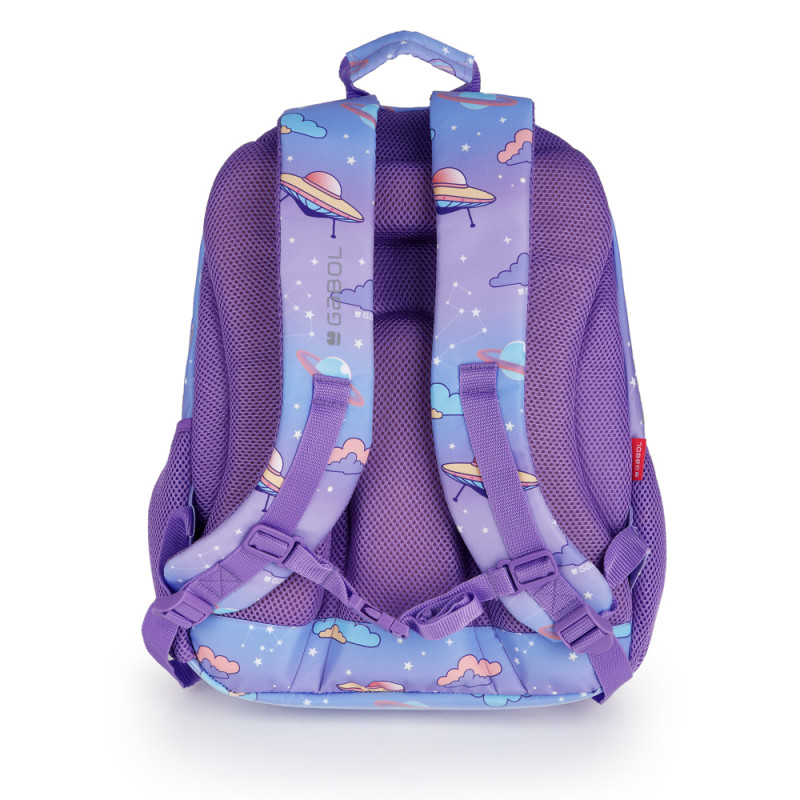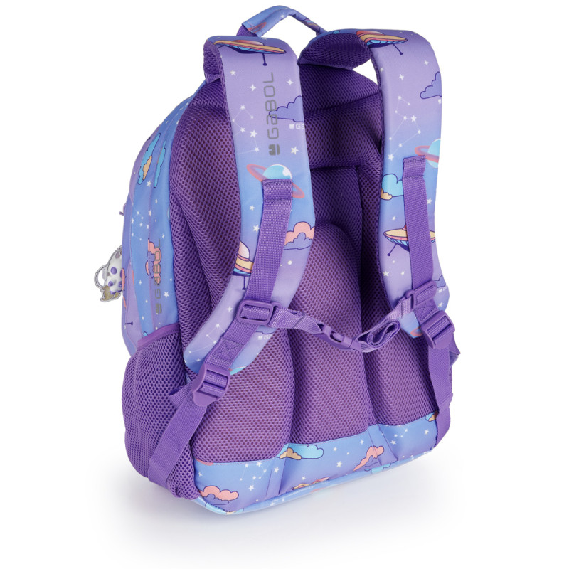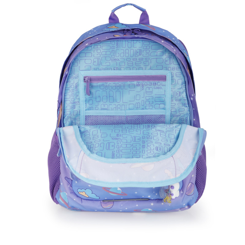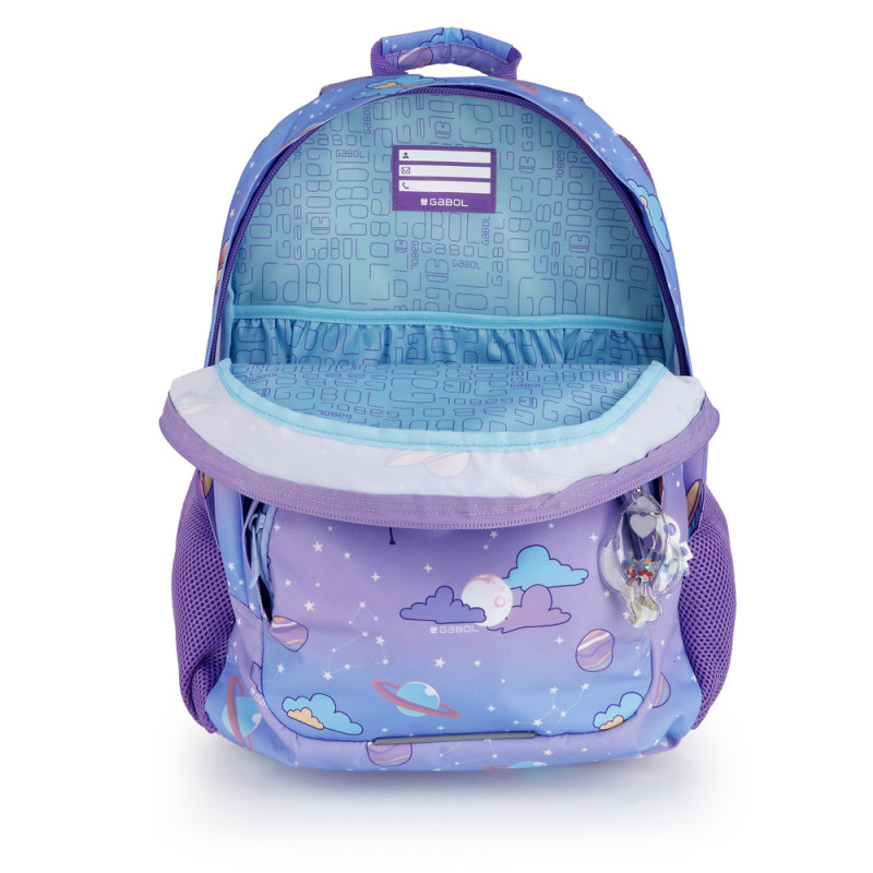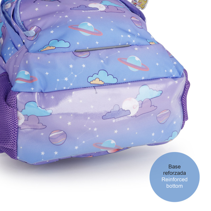 Mochila infantil tres compartimentos Gabol COSMOS. Fabricada en poliéster resistente al agua. Cuenta con espalda ergonómica de rejilla, identificador, organizador interno, acople a pecho, funda y capacidad para portátil de 15,6'', cremalleras cubiertas, base reforzada y elementos reflectantes. Medidas: 32x44x18cm.