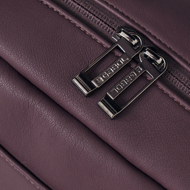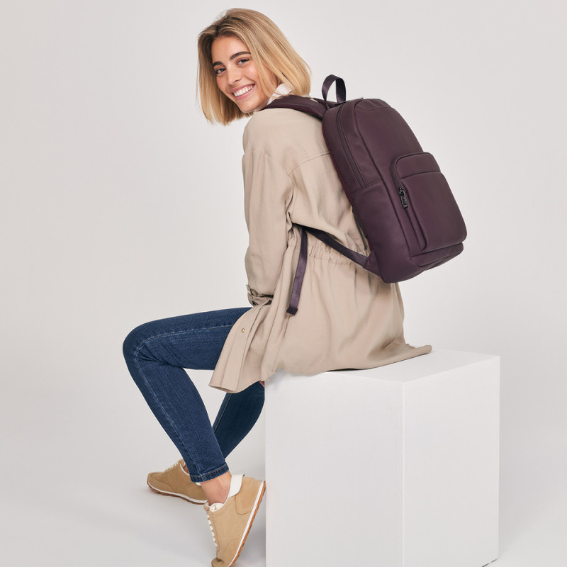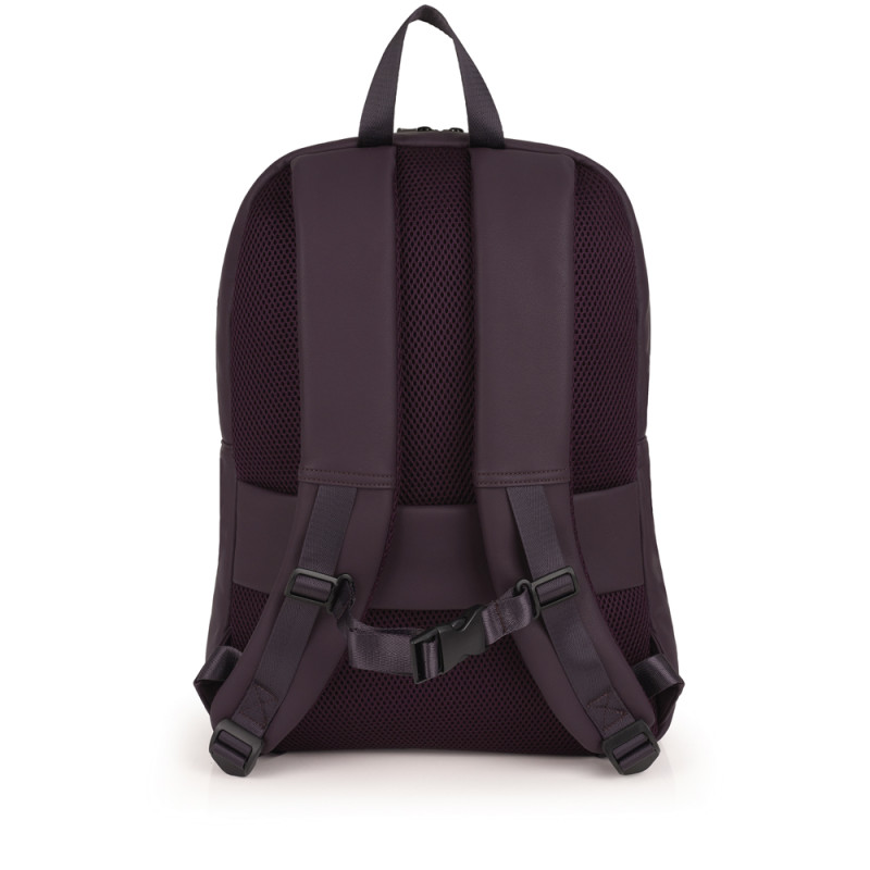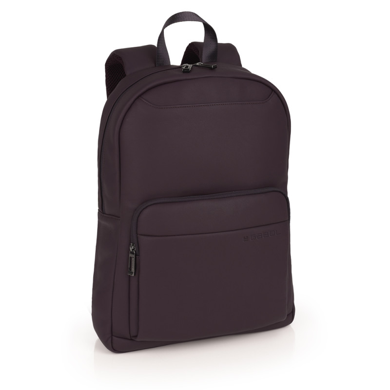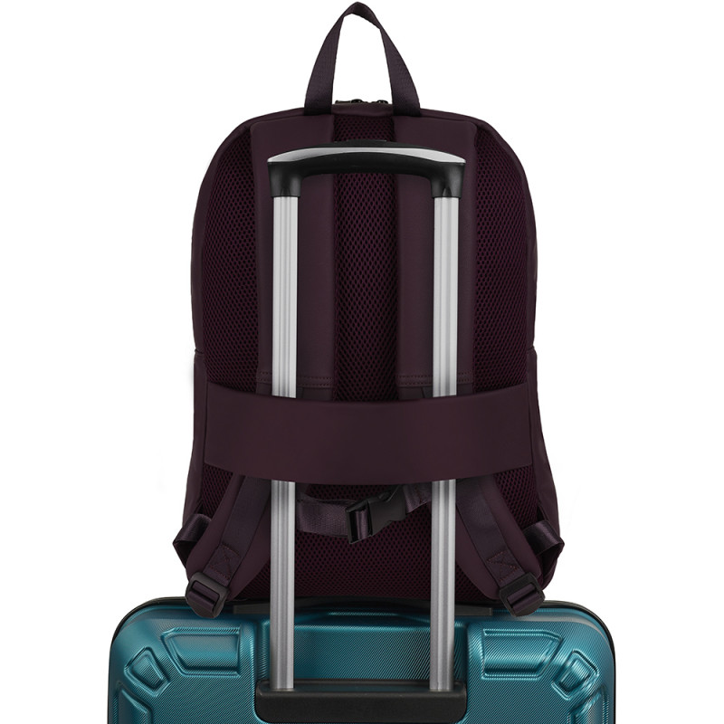Mochila para portátil de 15,6´´. Material de piel sintética libre de plásticos PVC. Interior acolchado con compartimento para portátil y organizador. Acople para maleta en la parte trasera. Cinta de sujección al pecho. Medidas: 44x32x9 cm. Capacidad de 13,5 L.