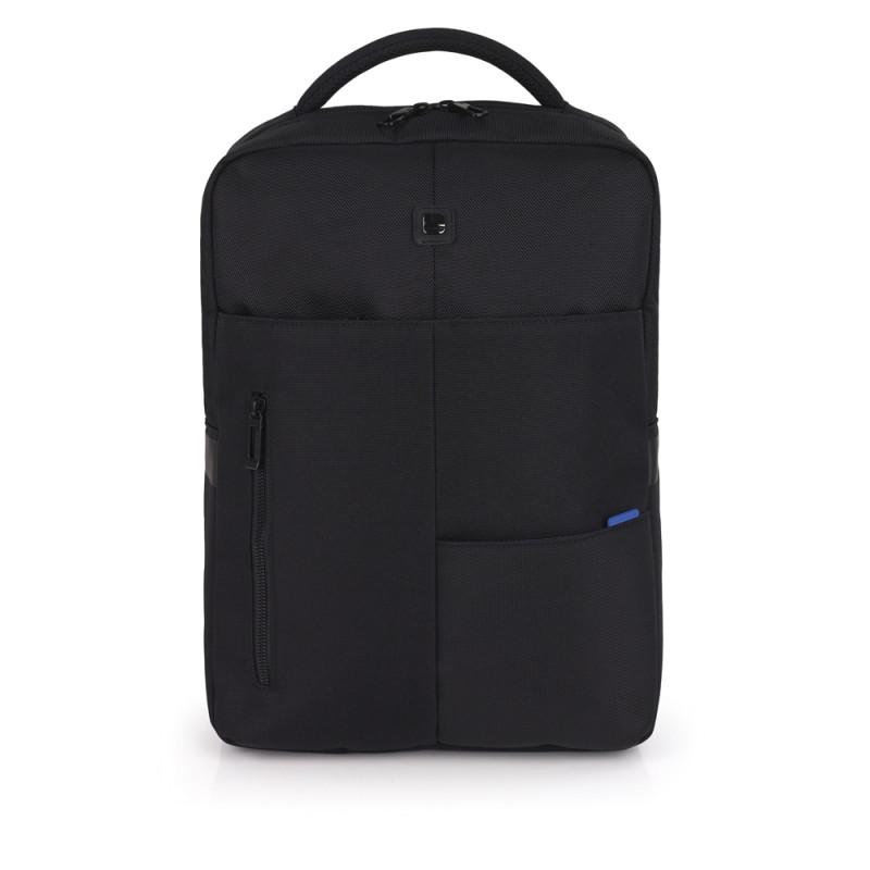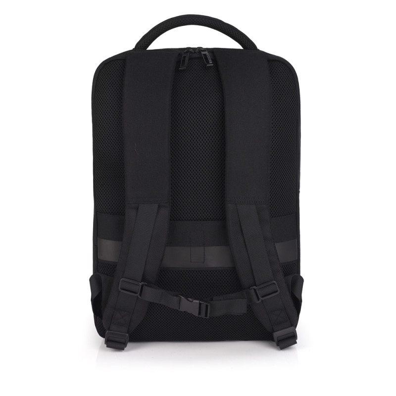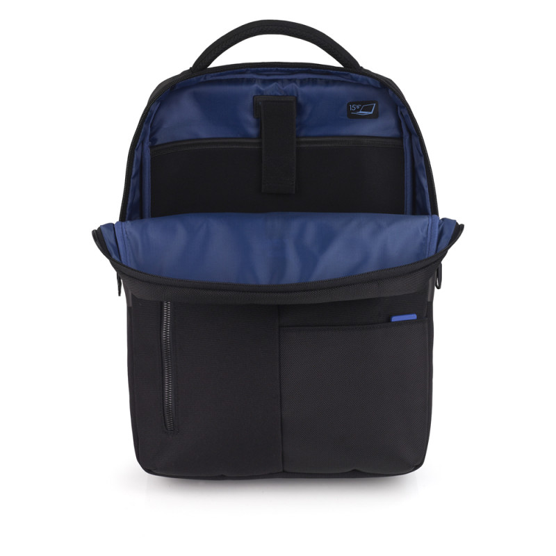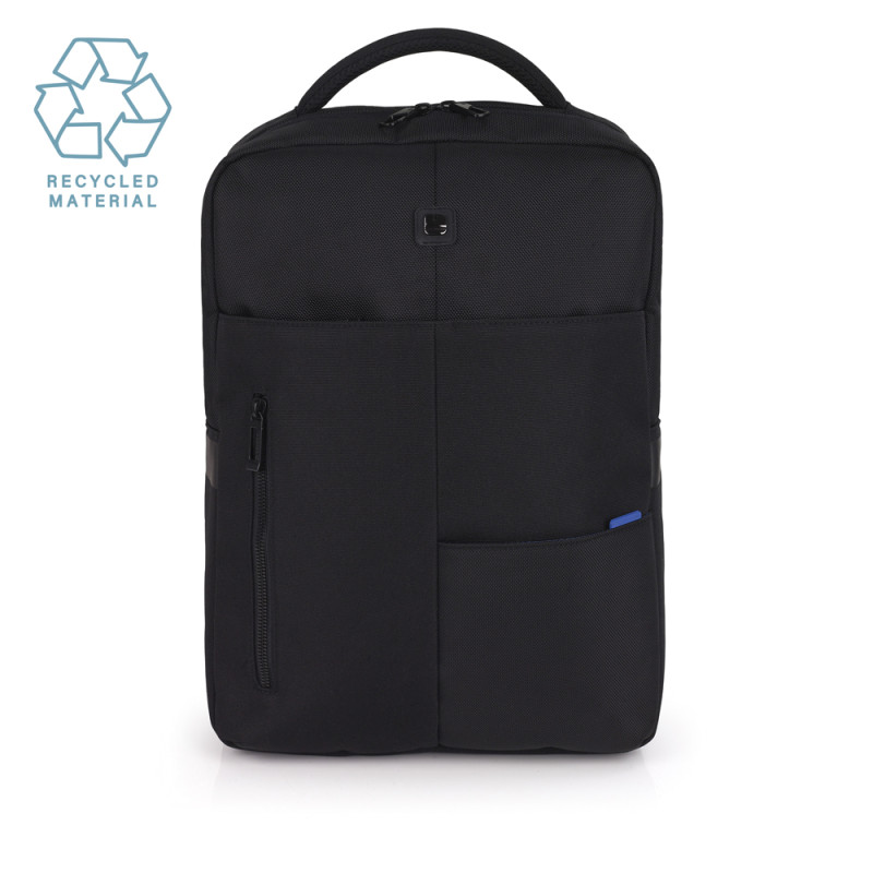 Mochila para portátil de 15,6´´ con 2 compartimentos. Fabricada con material hecho con plástico reciclado e impermeable. Los cursores de las cremalleras se enganchan entre sí para mayor seguridad. Interior acolchado con compartimento para portátil y organizador. Medidas: 43x31x12 cm. Capacidad de 14 L.