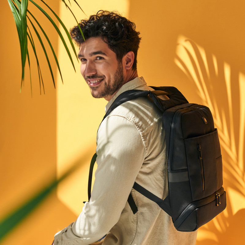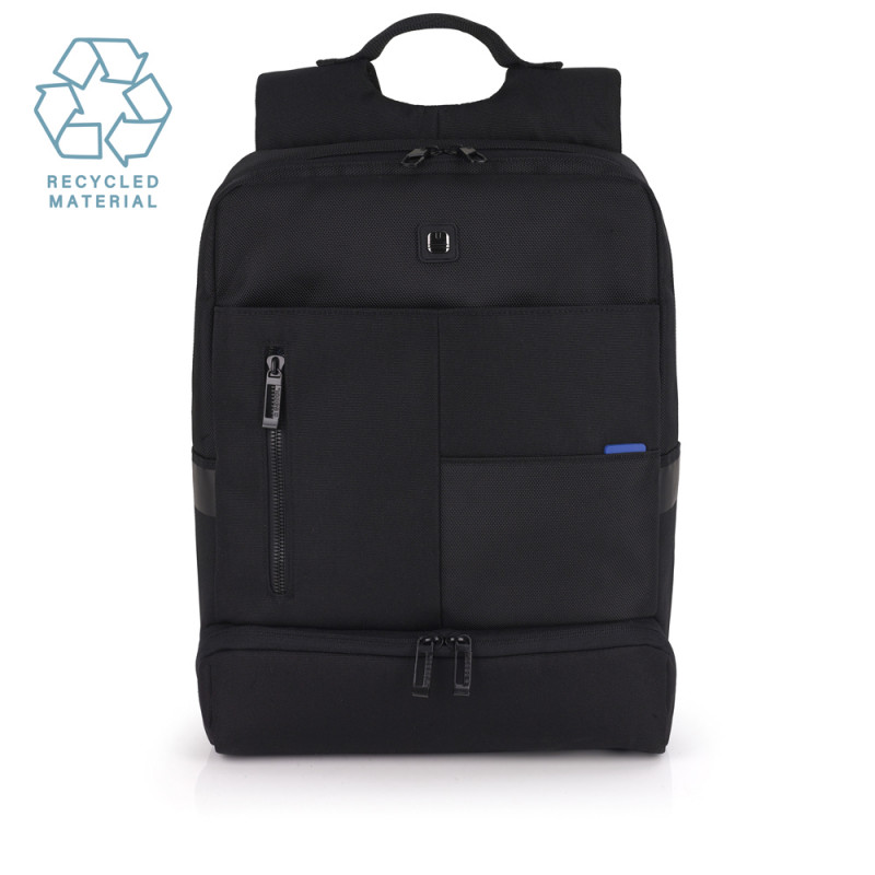 Mochila para portátil expandible de 15,6´´ a 17,3´´. Fabricada con material hecho con plástico reciclado e impermeable. Los cursores de las cremalleras se enganchan entre sí para mayor seguridad. Interior acolchado con compartimento para portátil y organizador. Acople para maleta en la parte trasera. Cinta de sujección al pecho. Medidas: 40/48x31x8 cm. Capacidad de 11 L.
