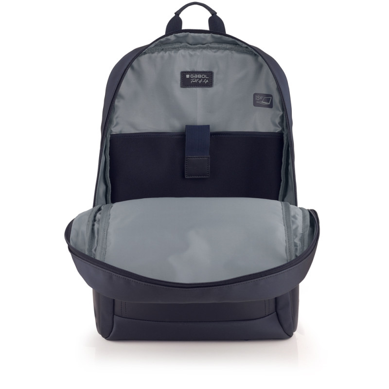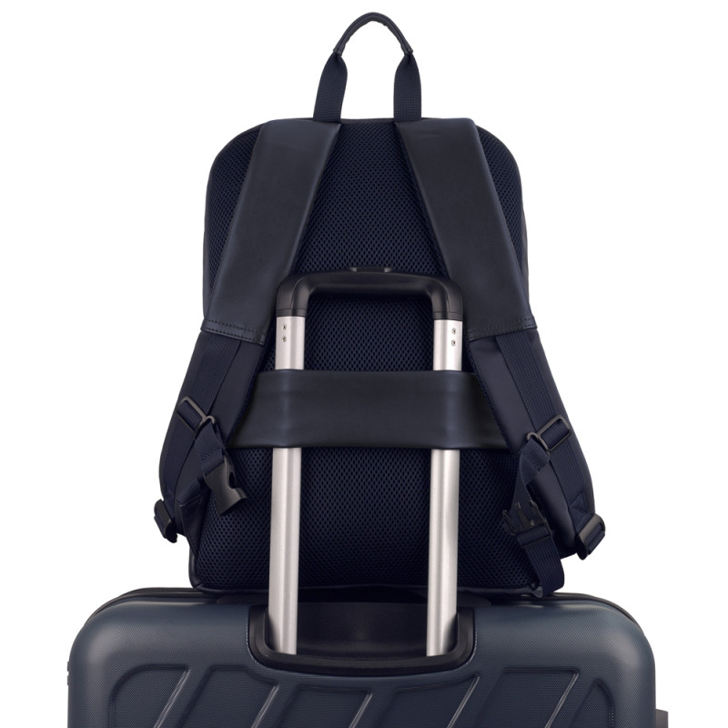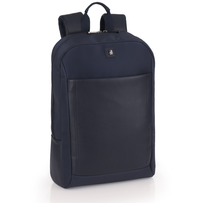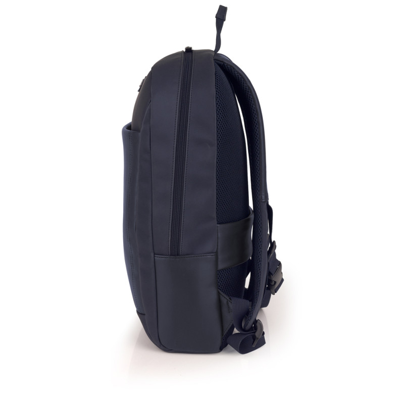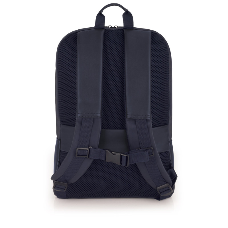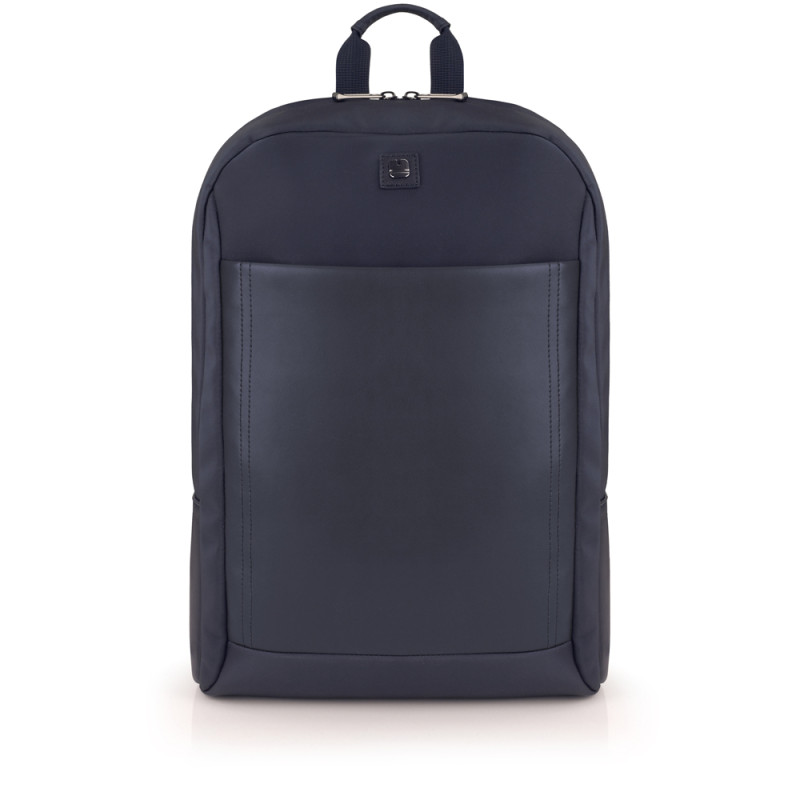 Mochila para portátil de 15,6'' de piel sintética, azul. El interior de la mochila está forrado y acolchado, con funda para portátil y organizador. Fabricada con material libre de plásticos PVC. Medidas: 31x44x10 cm. Volumen: 13,3 L