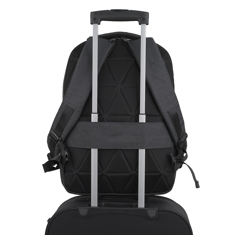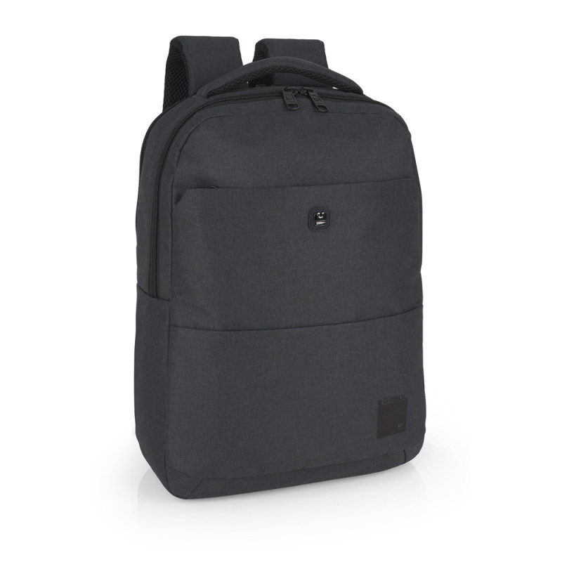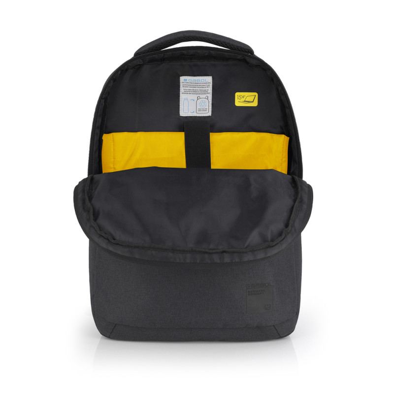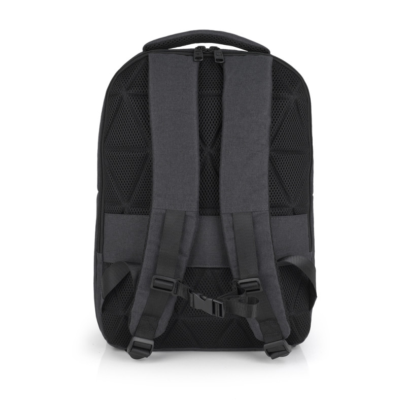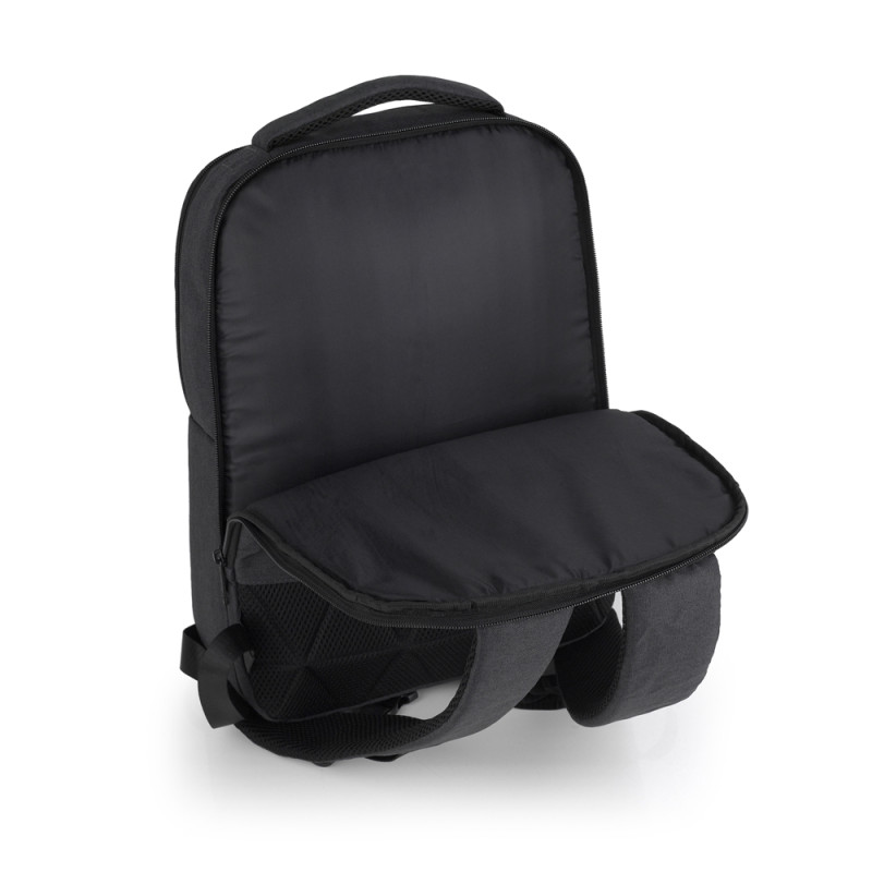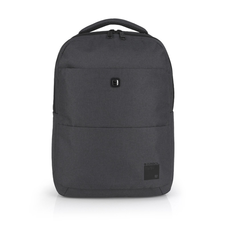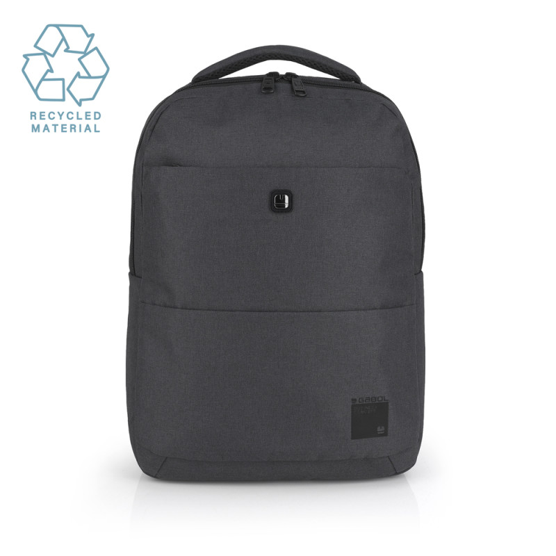 Mochila para portátil de 15,6'' de material reciclado, gris, con dos compartimentos. El interior de la mochila está forrado y acolchado, con funda para portátil y organizador. Fabricada con material libre de plásticos PVC. Medidas: 31x43x12 cm. Volumen 14 L
