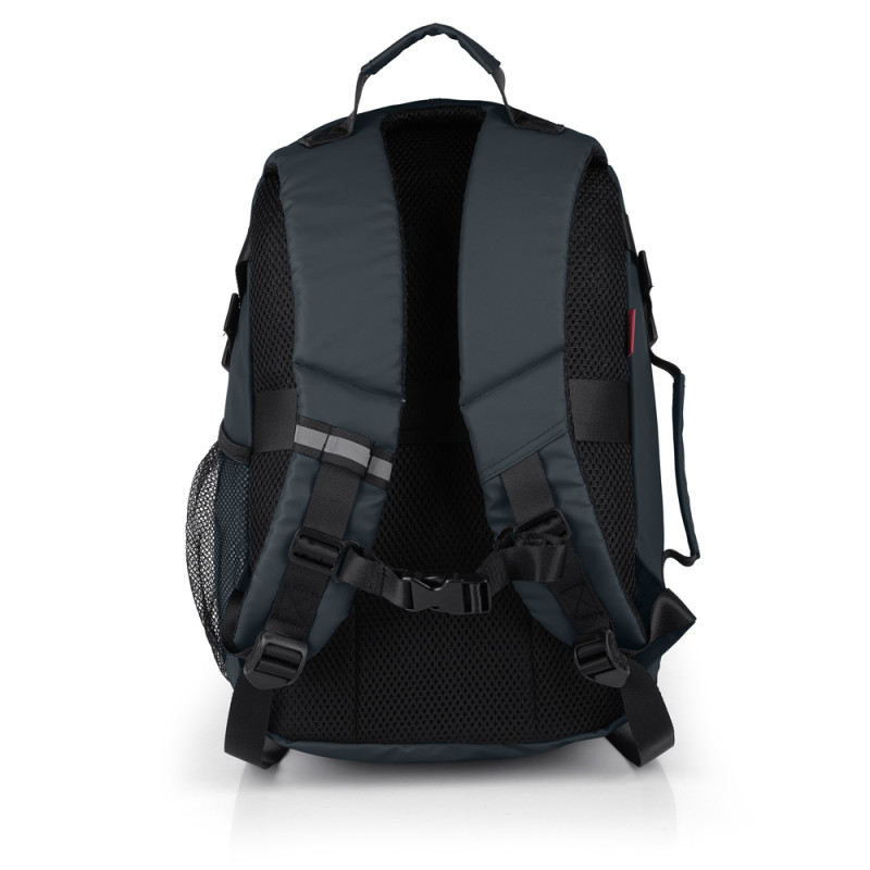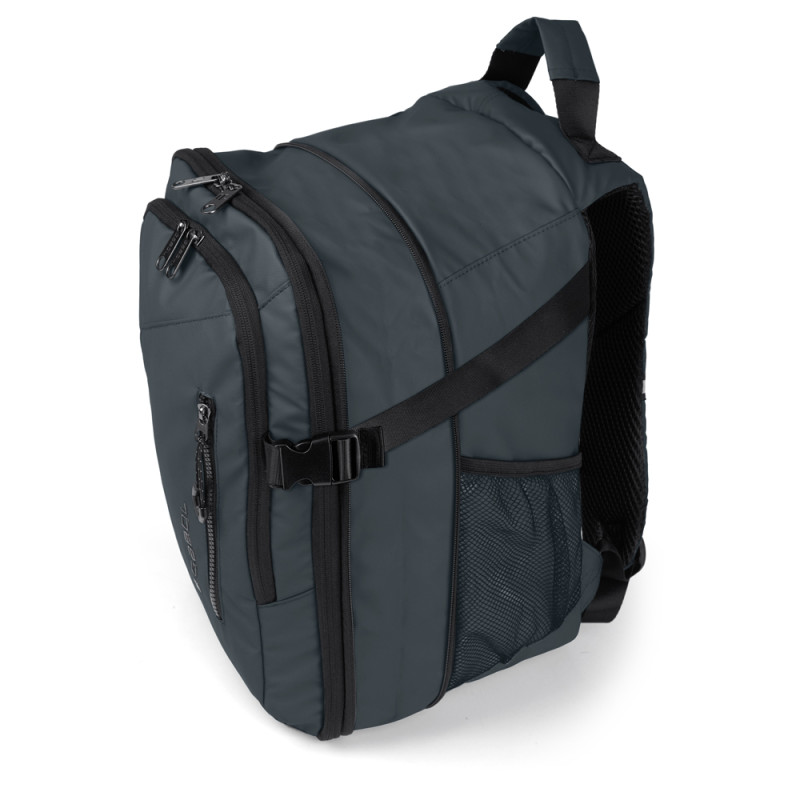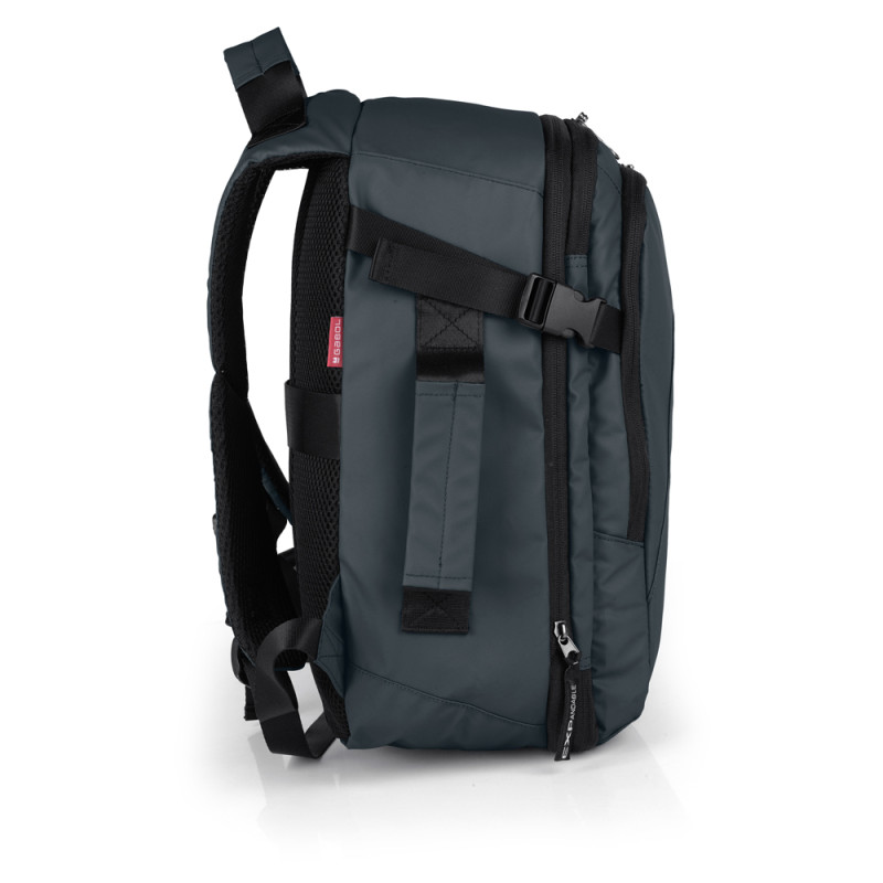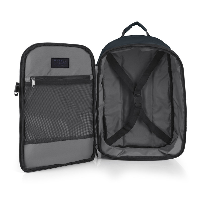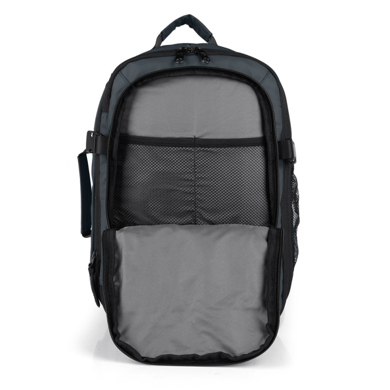 Mochila XS blanda, apta como equipaje de mano (underseat) expandible y con acople a maleta, con 2 departamentos, organizador interno. Fabricado en poliéster resinado y piel sintética, compuesto por un forro de alta calidad y un organizador interno. Medidas: 25x40x20/23 cm - Peso: 0,62 kg - Capacidad: 20/23 L