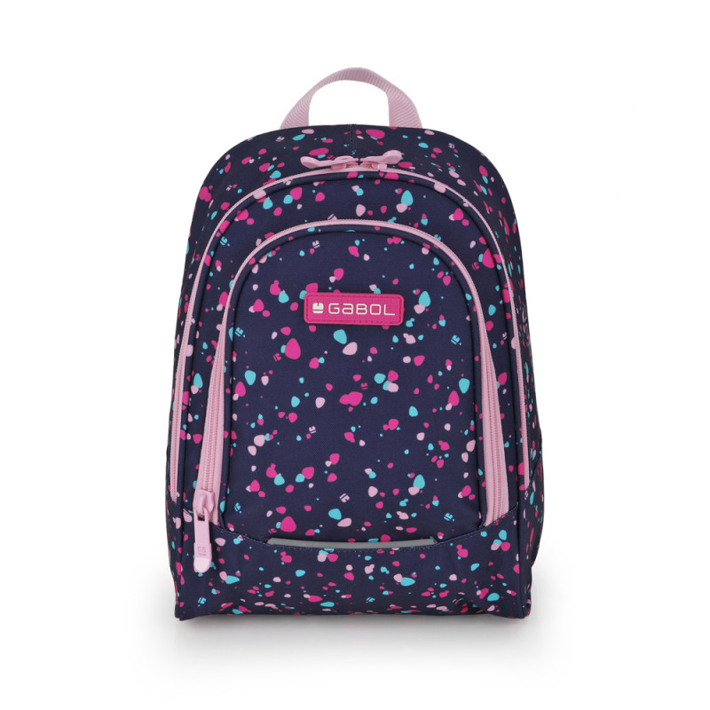 Mochila pequeña Gabol Party. Mochila escolar pequeña. Espalda acolchada para servir de amortiguación con el contenido. Incluye identificador para el nombre. Material resistente al agua. Fabricada con material libre de PVC, con un tejido de alta densidad y mayor calidad. Medidas: 24x30x10 cm
