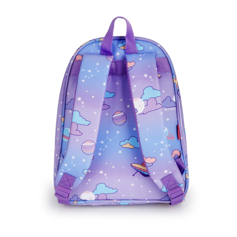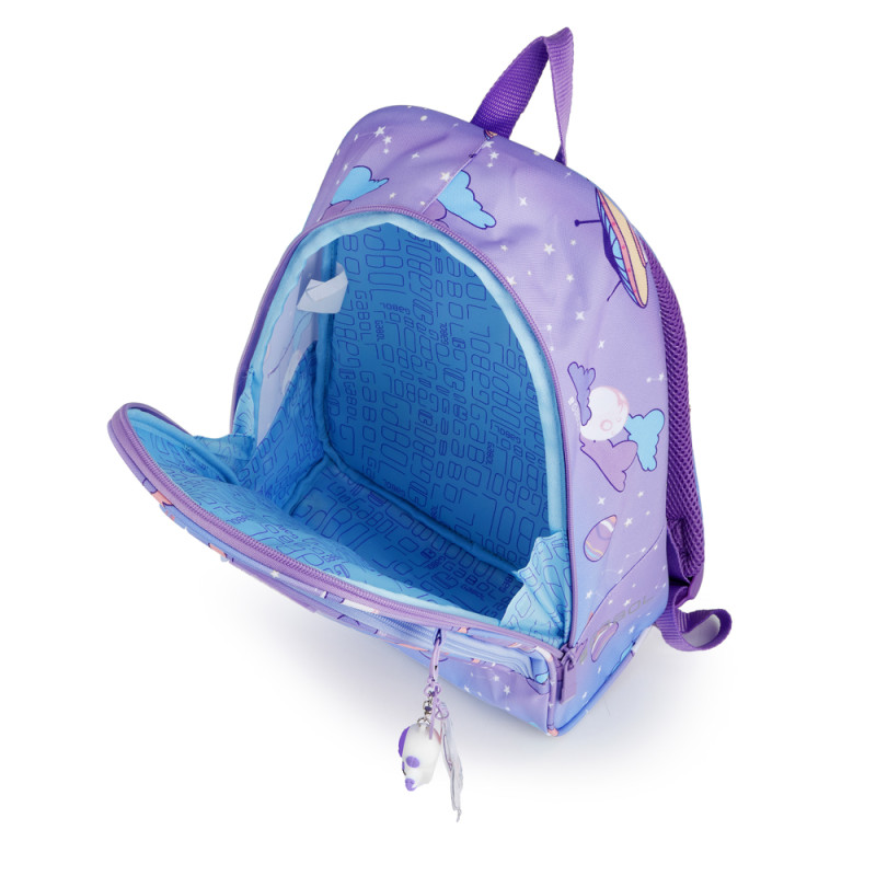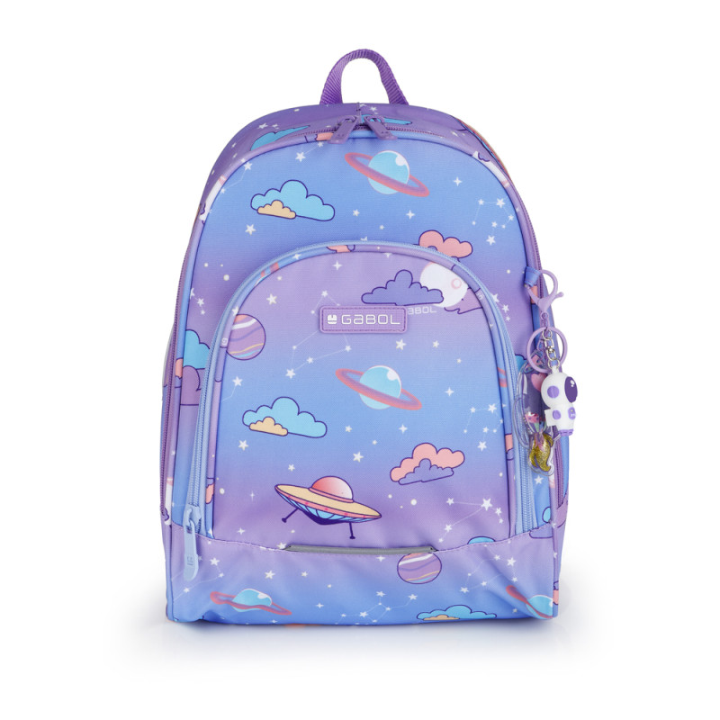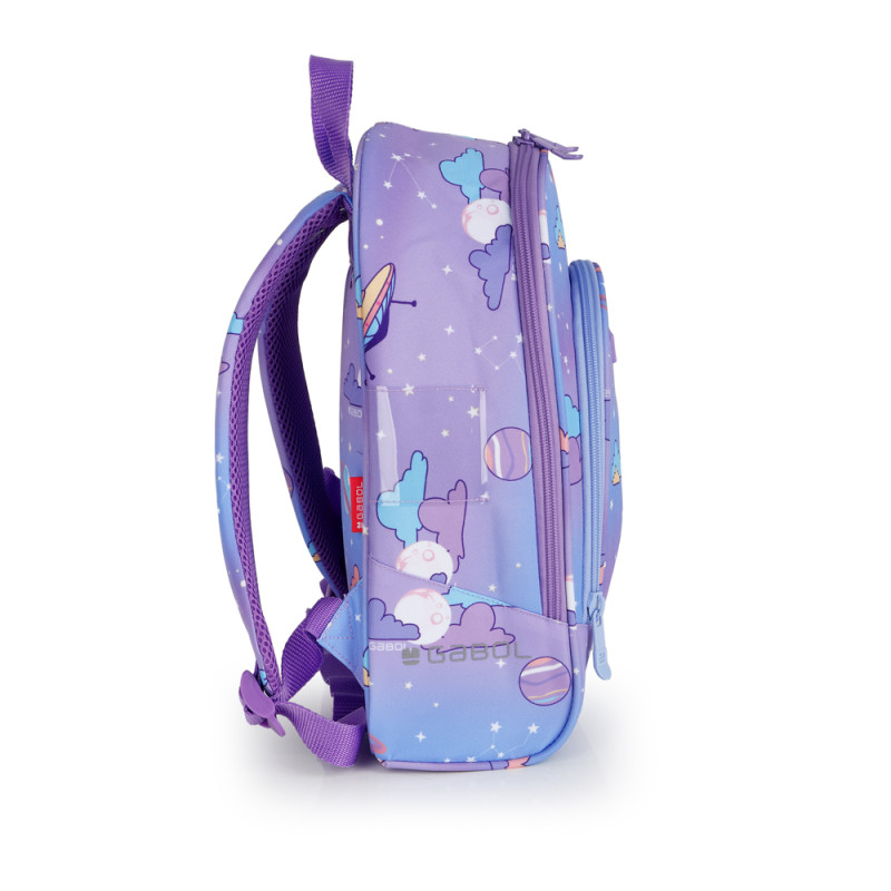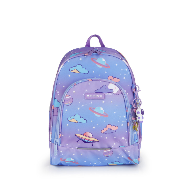 Mochila pequeña infantil Gabol COSMOS. Fabricada en poliéster resistente al agua. Cuenta con espalda acolchada, identificador y elementos reflectantes. Medidas: 27x34x12cm.
