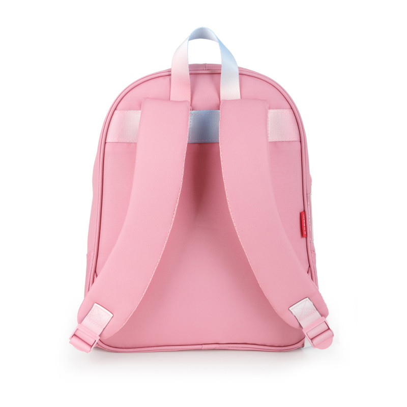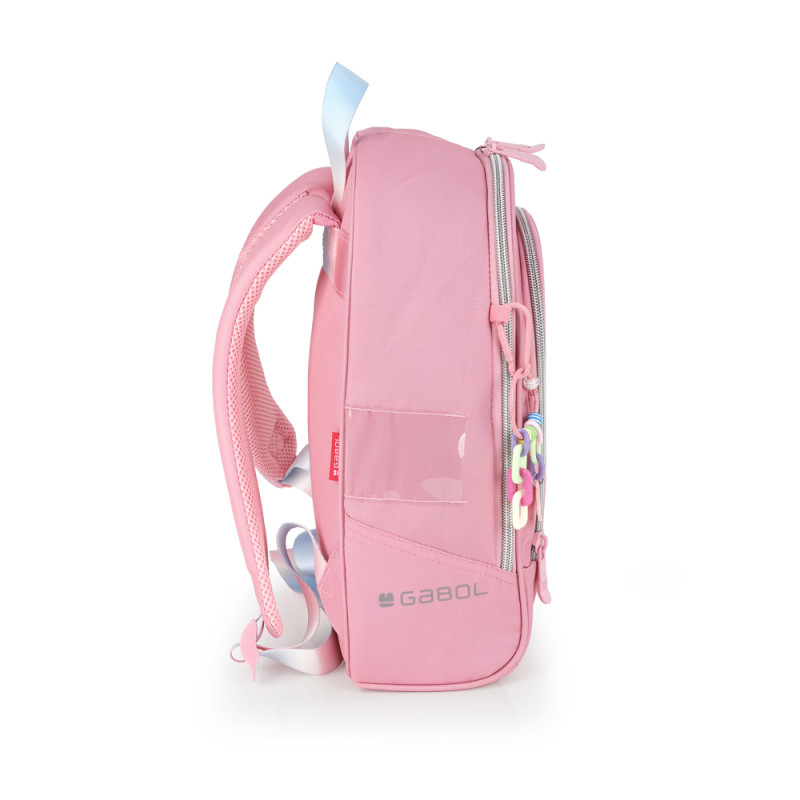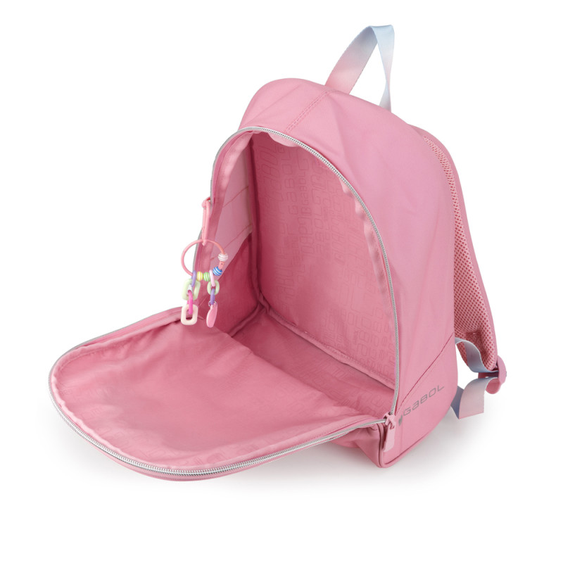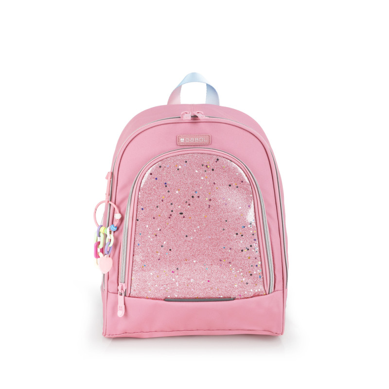 Mochila pequeña Gabol GLAM. Fabricada en poliéster y piel sintética con purpurina. Cuenta con espalda acolchada, identificador y elementos reflectantes. Es resistente al agua. Medidas: 27x34x12cm.
