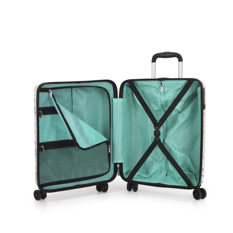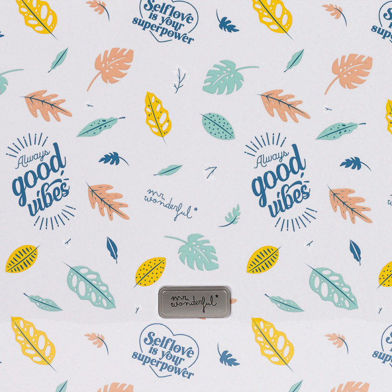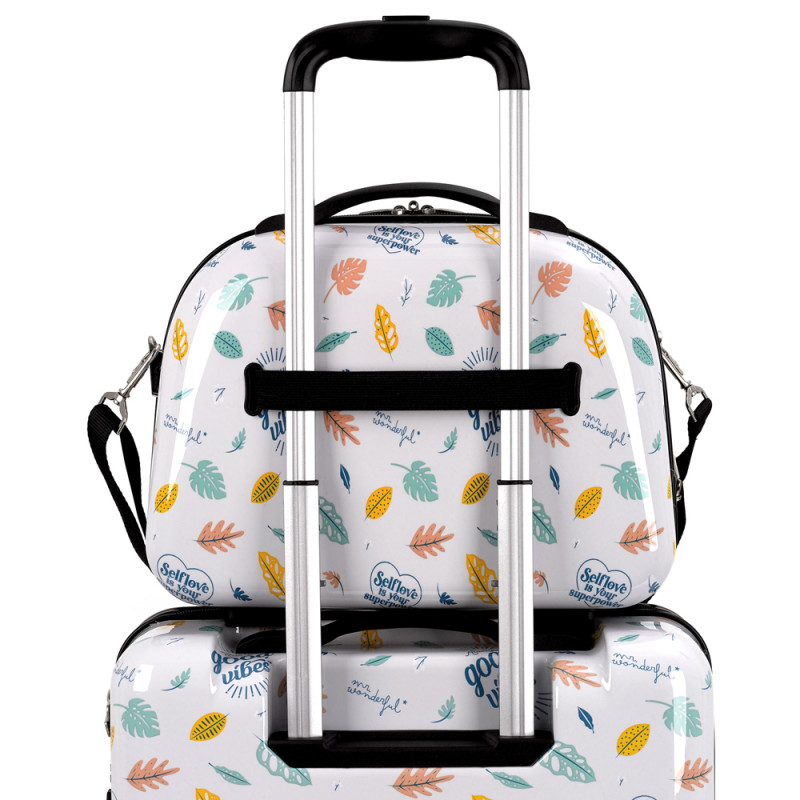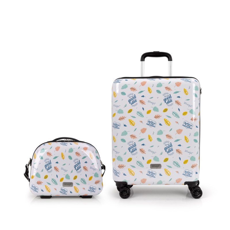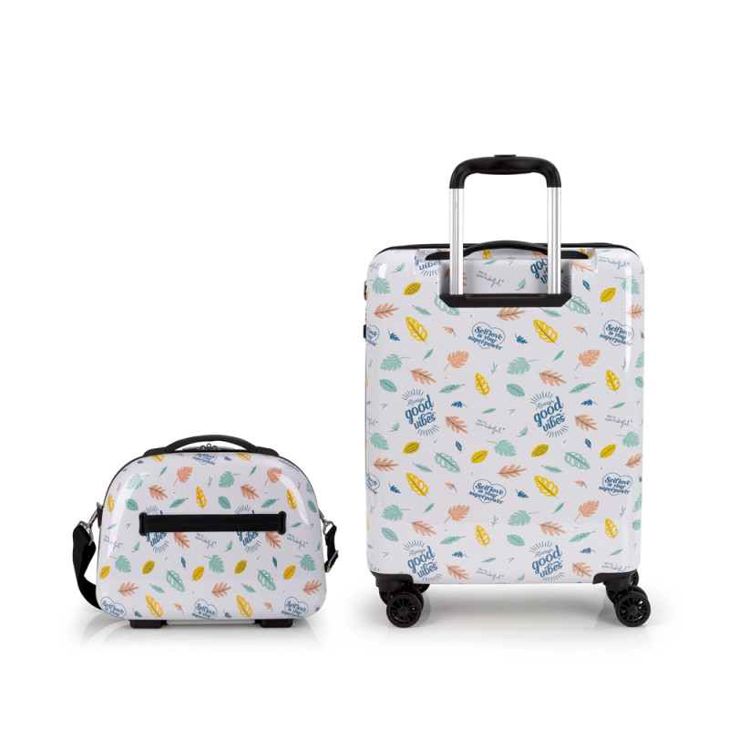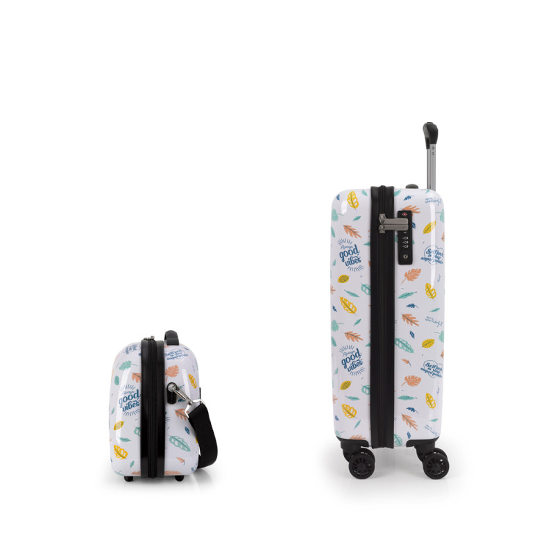 ección Vibes de Mr. Wonderful x Gabol, con un original estampado de hojas. Always good Vibes. Selflove is your superpower. Set de maleta de cabina más neceser rígido, con capacidad total de 52,2 L. El material de fabricación es ABS con film y su interior está compuesto por un forro de alta calidad con bolsillos. Cerradura TSA. La maleta tiene un tamaño apto para cabina y la constitución de sus materiales hacen que su peso sea ligero, perfecto para la movilidad. El neceser incluye bandolera y acople para la maleta que facilita su transporte. Medidas Maleta Cabina:40x55x20 cm