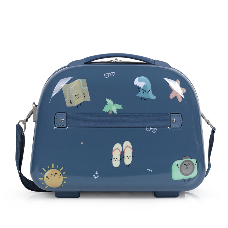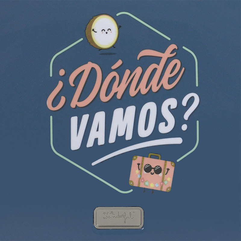 Neceser Dónde Vamos de Mr. Wonderful azul con divertidos dibujos. Fabricado en ABS y policarbonato. Forrado con un bonito estampado, bolsillo y espejo interior. Lleva correa extraible y cinta para acoplarlo en una maleta.