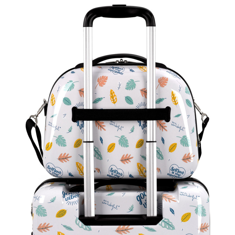 Colección Vibes de Mr. Wonderful x Gabol, con un original estampado de hojas. Always good Vibes. Selflove is your superpower. Neceser rígido, con capacidad de 14 L. El material de fabricación es ABS con film y su interior está compuesto por un forro de alta calidad con bolsillos. Incluye bandolera y acople para la maleta que facilita su transporte.
