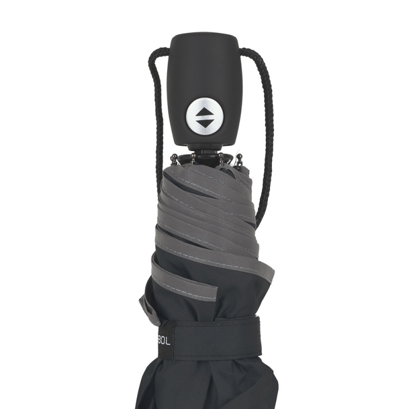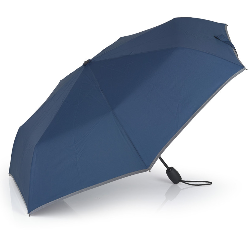 Paraguas pleglable. Apertura y cierre automático. Resistente al viento. 7 varillas de 53 cm. 55 cm abierto. 28 cm plegado. Detalle reflectante,
