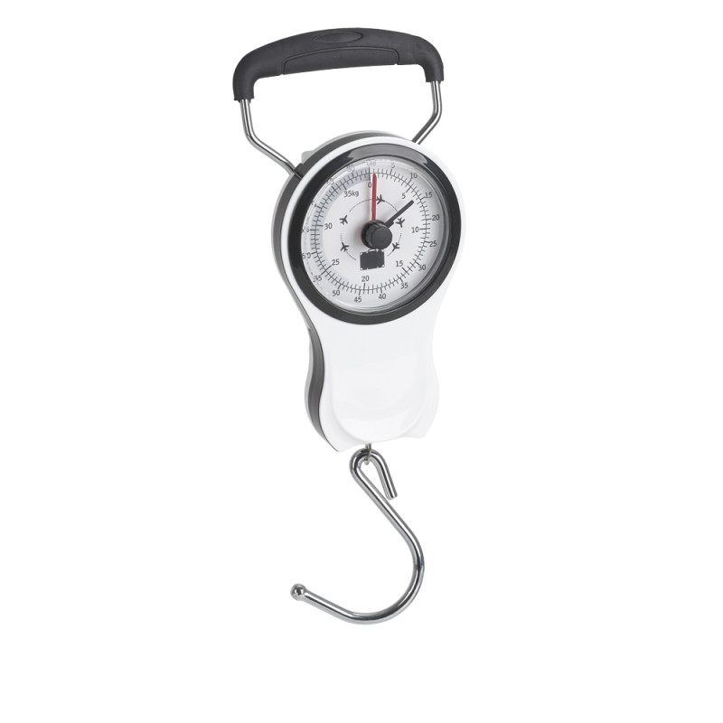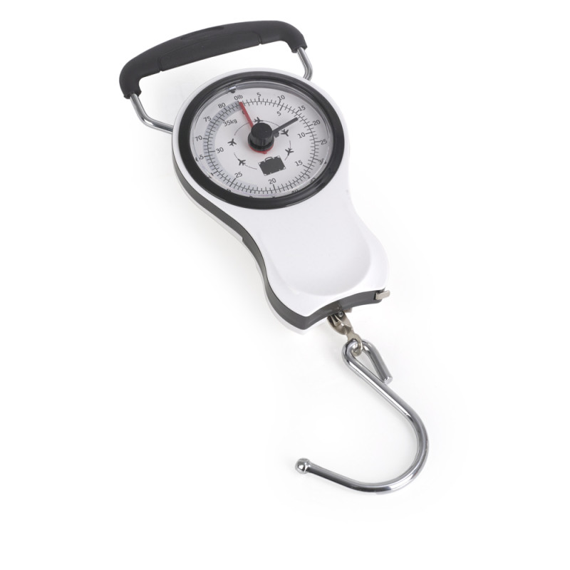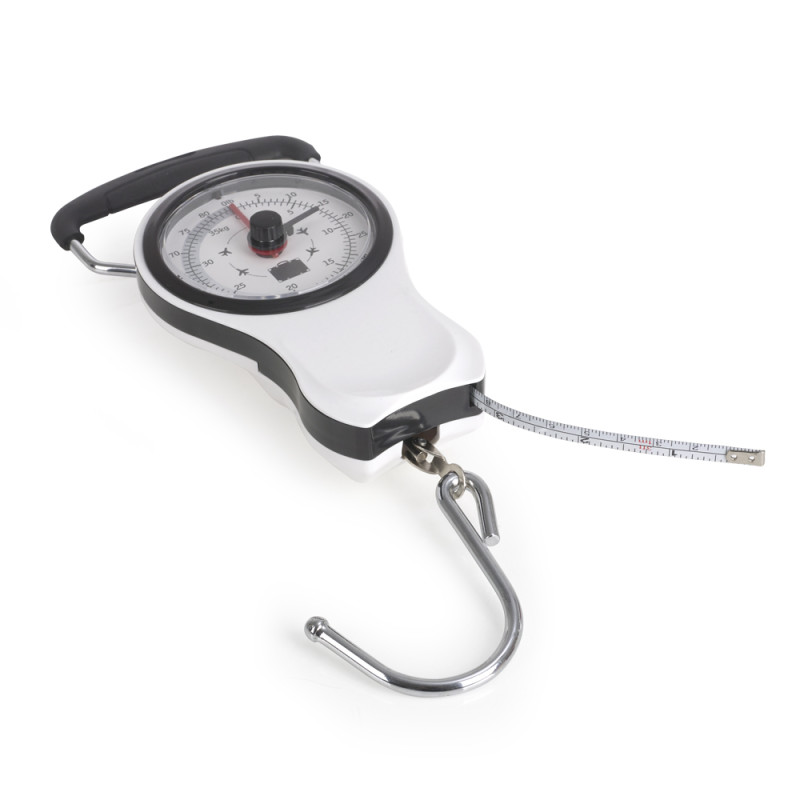 Báscula blanca que permite medir el peso de tu maleta de viaje. Incluye metro. Medidas: 9x14x4 cm. Peso: 0,19Kg.Medidas: 9 x 14 x 4 cm - Peso: 0,19 kg
