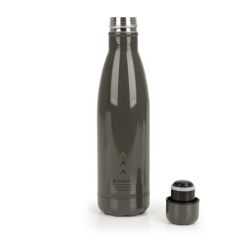 Botella térmica de acero inoxidable 500 ml. Mantiene el frío y el calor 7 horas, aproximandamente. Medidas: 7x27x7 cm