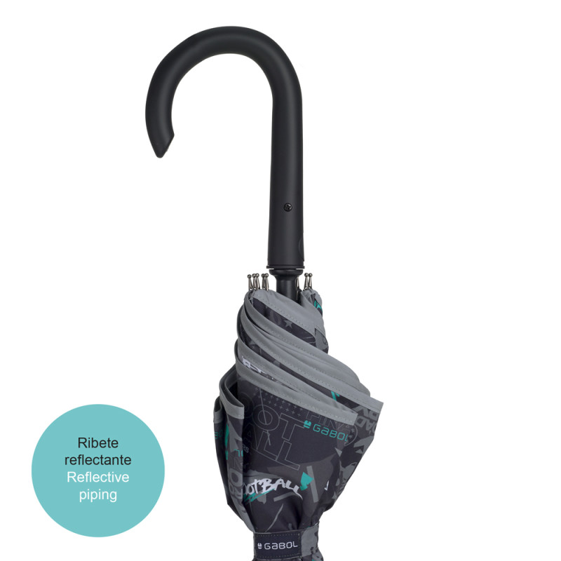 Paraguas Gabol SCORE. Paraguas. Apertura automática. Resistente al viento. 54 cm largo varilla. 8 varillas de fibra de vidrio. 82 cm largo de paraguas. 96 cm de diámetro. Material Poliéster. Ribete reflectante.