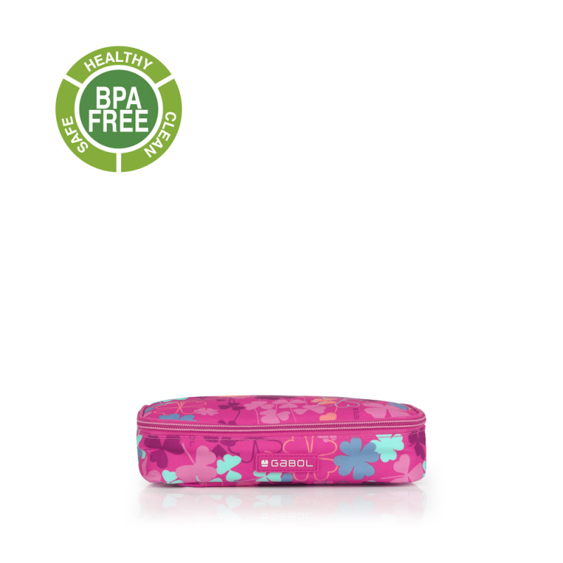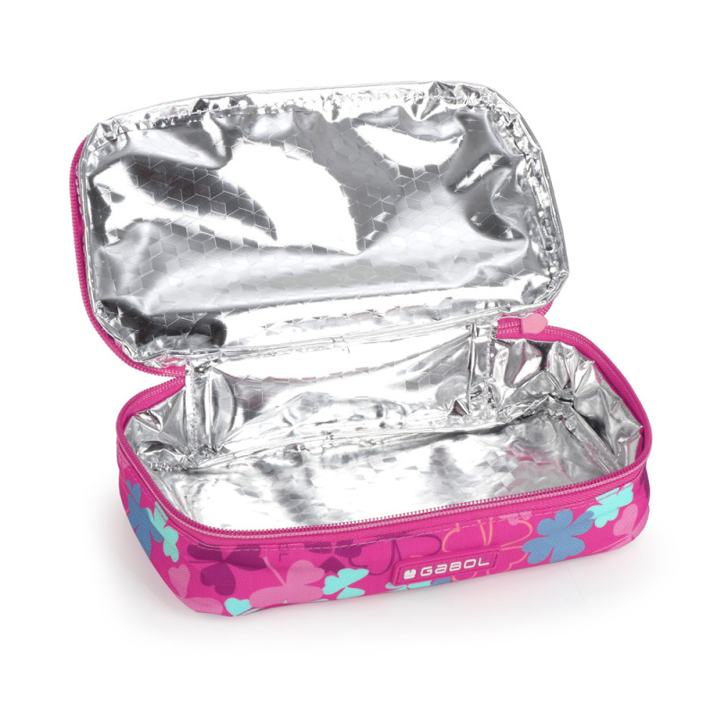 Porta alimentos térmico Gabol CLOVER. Porta alimentos térmico, sin BPA. Fabricado con material libre de PVC con un tejido de alta densidad y alta calidad. Material resistente al agua. Contiene identificador para poner el nombre. Cinta para acoplarlo a un carro/maleta. Interior acolchado. Medidas: 25x21x13 cm