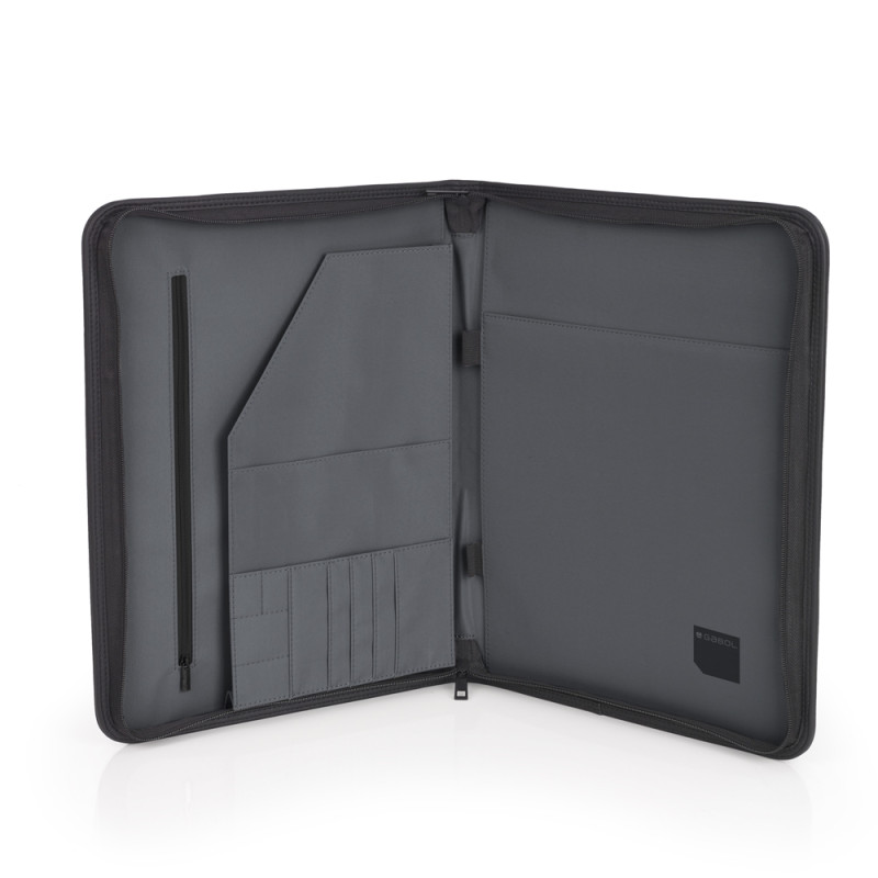 Portafolio medida A4 (38x30x4 cm). Capacidad para: 1 bolg A4, 2 bolígrafos, 2 tarjetas Micro SD, 2 tarjetas SD, 4 tarjetas de visita. Material: Piel sintética.