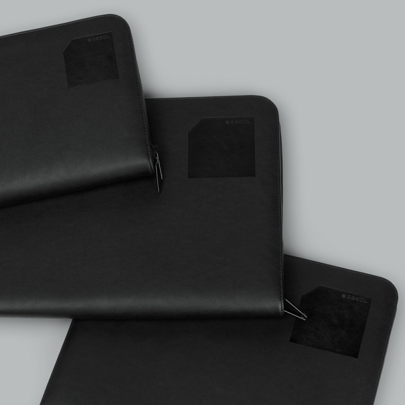 Portafolio medida A4 (38x30x4 cm). Capacidad para: 1 bolg A4, 2 bolígrafos, 2 tarjetas Micro SD, 2 tarjetas SD, 4 tarjetas de visita. Material: Piel sintética.